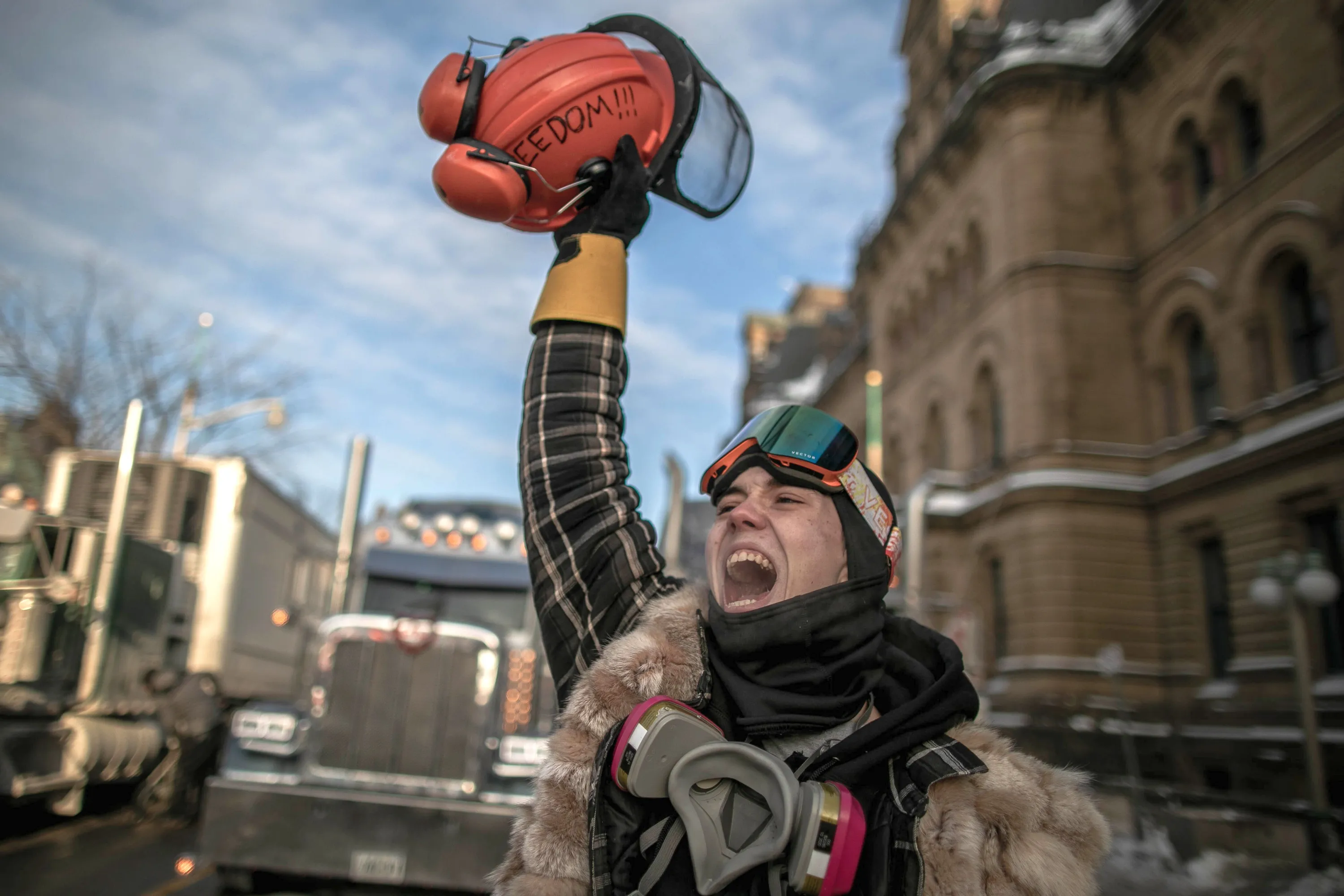 Truck drivers and supporters protest against vaccine mandates in the trucking industry in Ottawa, Canada on January 31, 2022. The protest has attracted international attention and grown to become a wider demonstration against the federal government's handling of the COVID-19 pandemic. (Photo by Amru Salahuddien/Anadolu Agency via Getty Images)