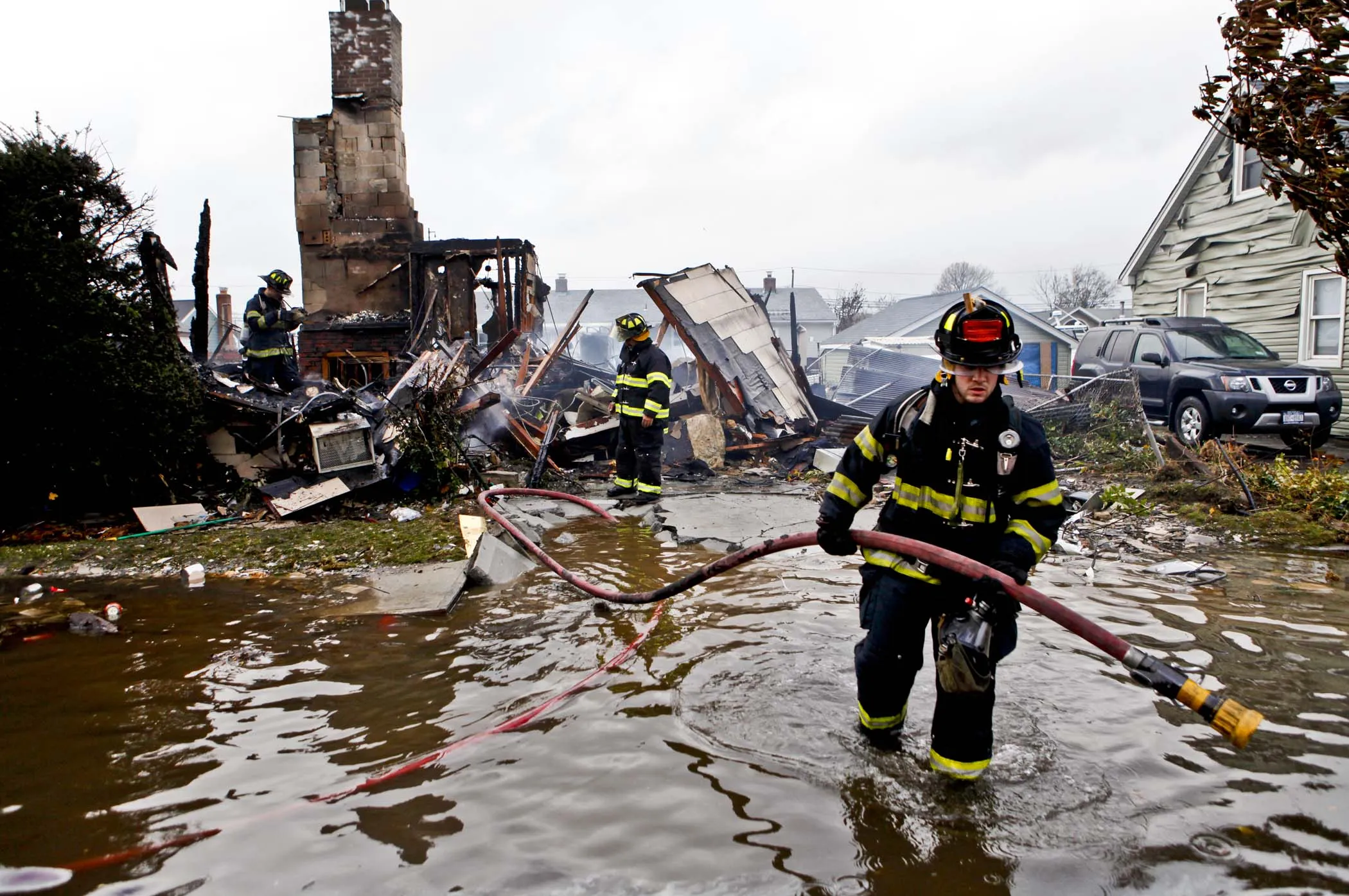 Firefighters work at the scene of a house fire in Lindenhurst, New York. According to firefighters at the scene, four homes were destroyed by fire overnight in Lindenhurst, and six in Massapequa. (Photo by Jason DeCrow/AP Photo)