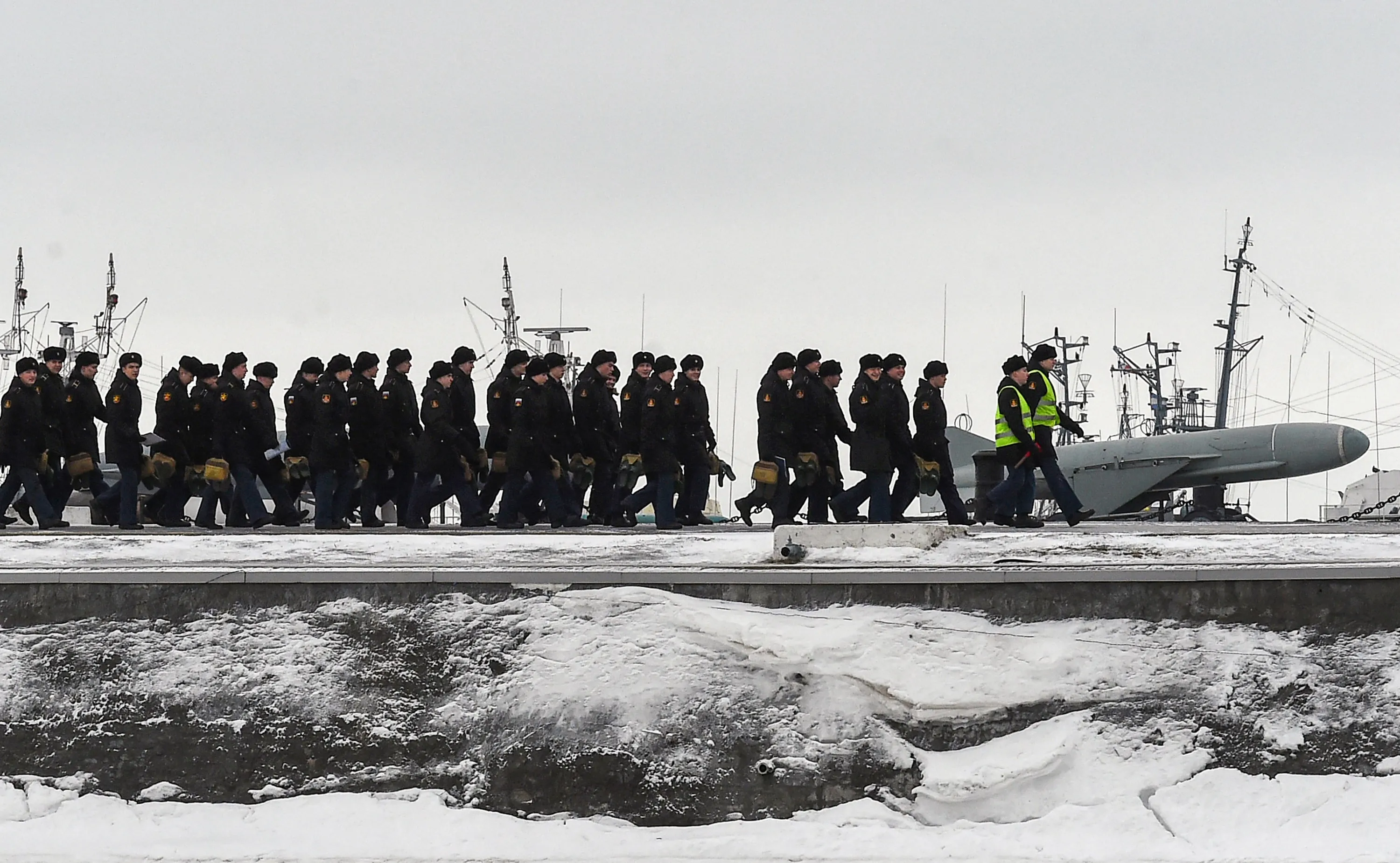 Russia's naval cadets walk along a pier at the Kronshtadt Naval base, outside Saint Petersburg, on January 19, 2022. (Photo by Olga Maltseva/AFP Photo)