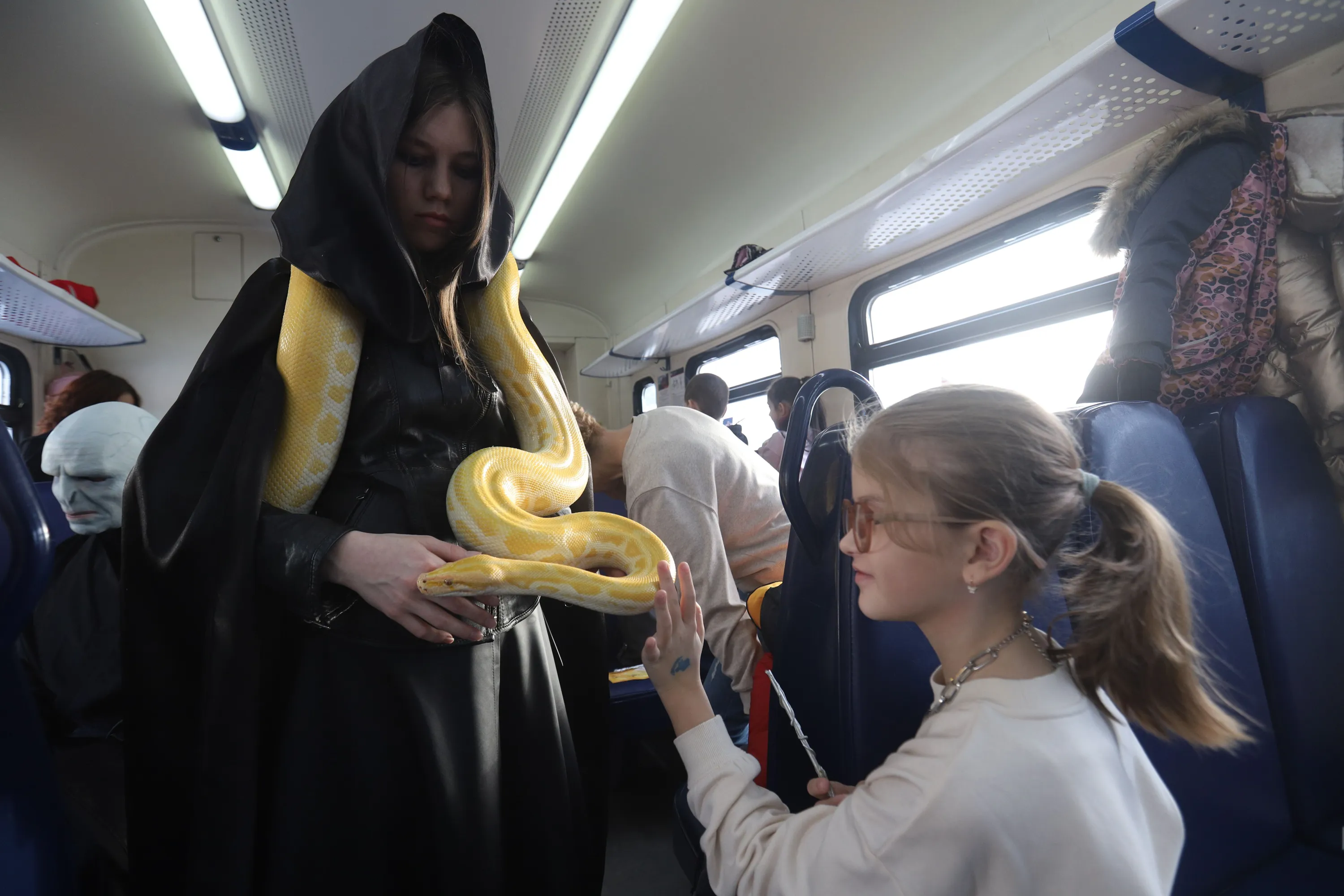 A train jorney for fans of Harry Potter launched in Saint-Petersburg in the real train called Hogwarts express, duration of a trip around 2 hours, actors wearing costumes of heroes of Harry Potter story perform several activities and take photos with fans on January 22, 2022. (Photo by Sergey Mihailicenko/Anadolu Agency via Getty Images)