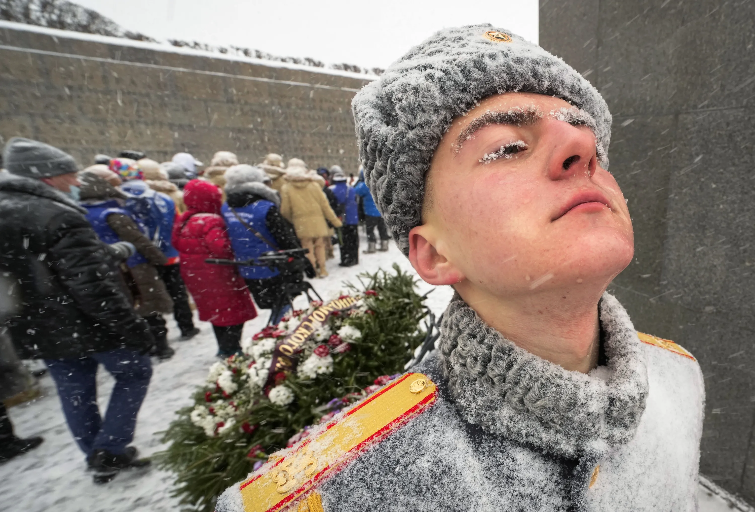 A honour guard soldier stands in snowfall as people walk to the Motherland monument to place flowers and wreaths at the Piskaryovskoye Cemetery where most of the Leningrad Siege victims were buried during World War II, in St.Petersburg, Russia, Thursday, January 27, 2022. People gathered to mark the 78th anniversary of the battle that lifted the Siege of Leningrad. The Nazi German and Finnish siege and blockade of Leningrad, now known as St. Petersburg, was broken on Jan. 18, 1943 but finally lifted Jan. 27, 1944. More than 1 million people died mainly from starvation during the 900-day siege. (Photo by Dmitri Lovetsky/AP Photo)