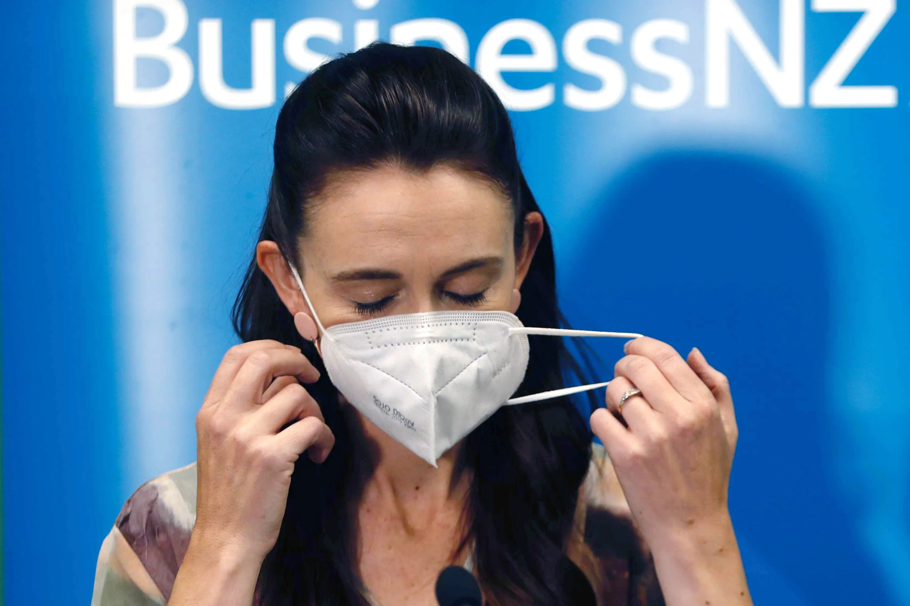 New Zealand Prime Minister Jacinda Ardern removes her mask before she outlines the Government's plans, Thursday, February 3, 2022, that will dismantle its quarantine system and reopen its borders the world. Since the start of the pandemic, New Zealand has enacted some of the world's strictest border controls. (Photo by Dean Purcell/New Zealand Herald via AP Photo)