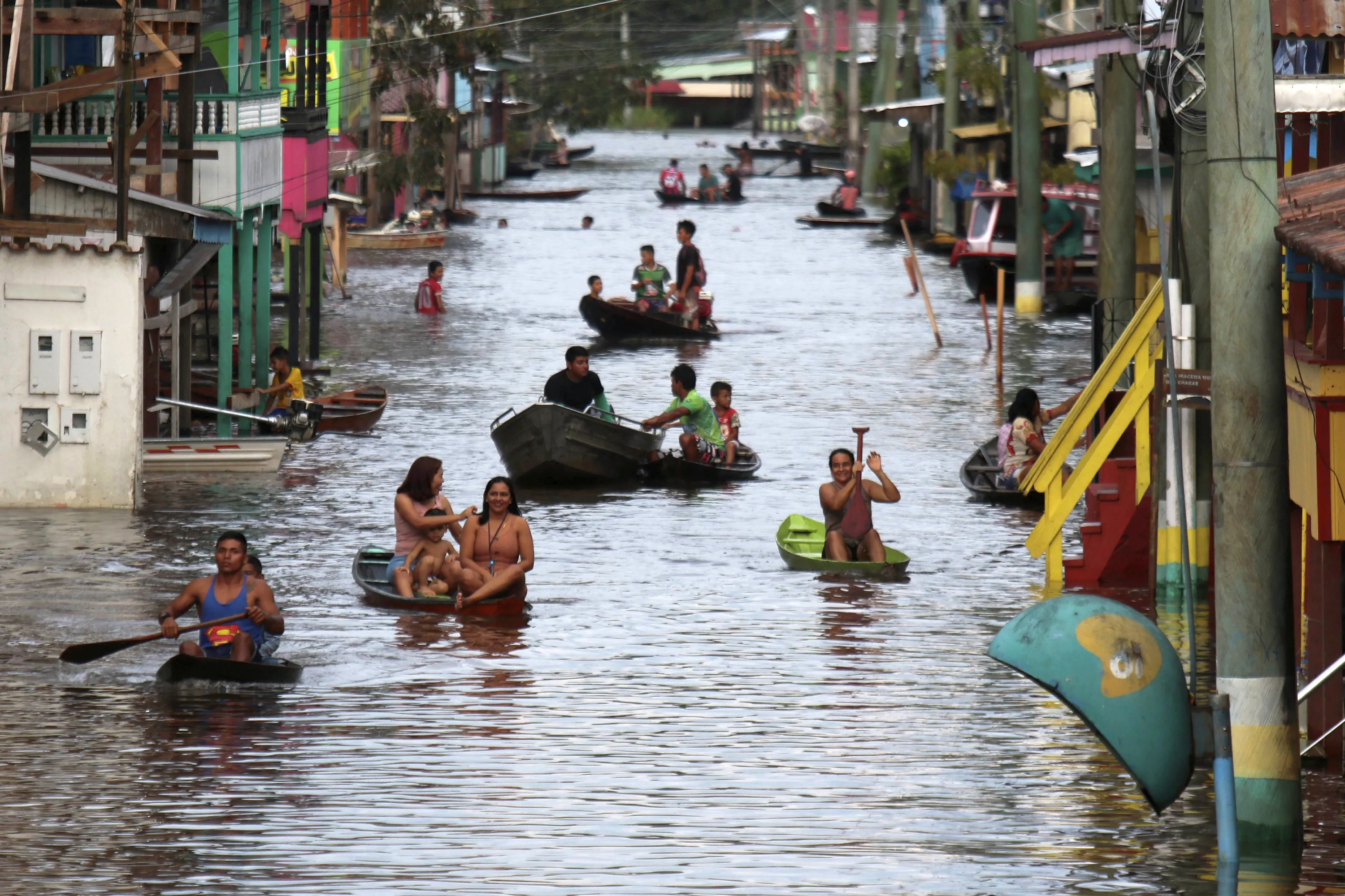 Residents navigate a flooded street in Anama, Amazonas state, Brazil, Thursday, May 13, 2021. (Photo by Edmar Barros/AP Photo)