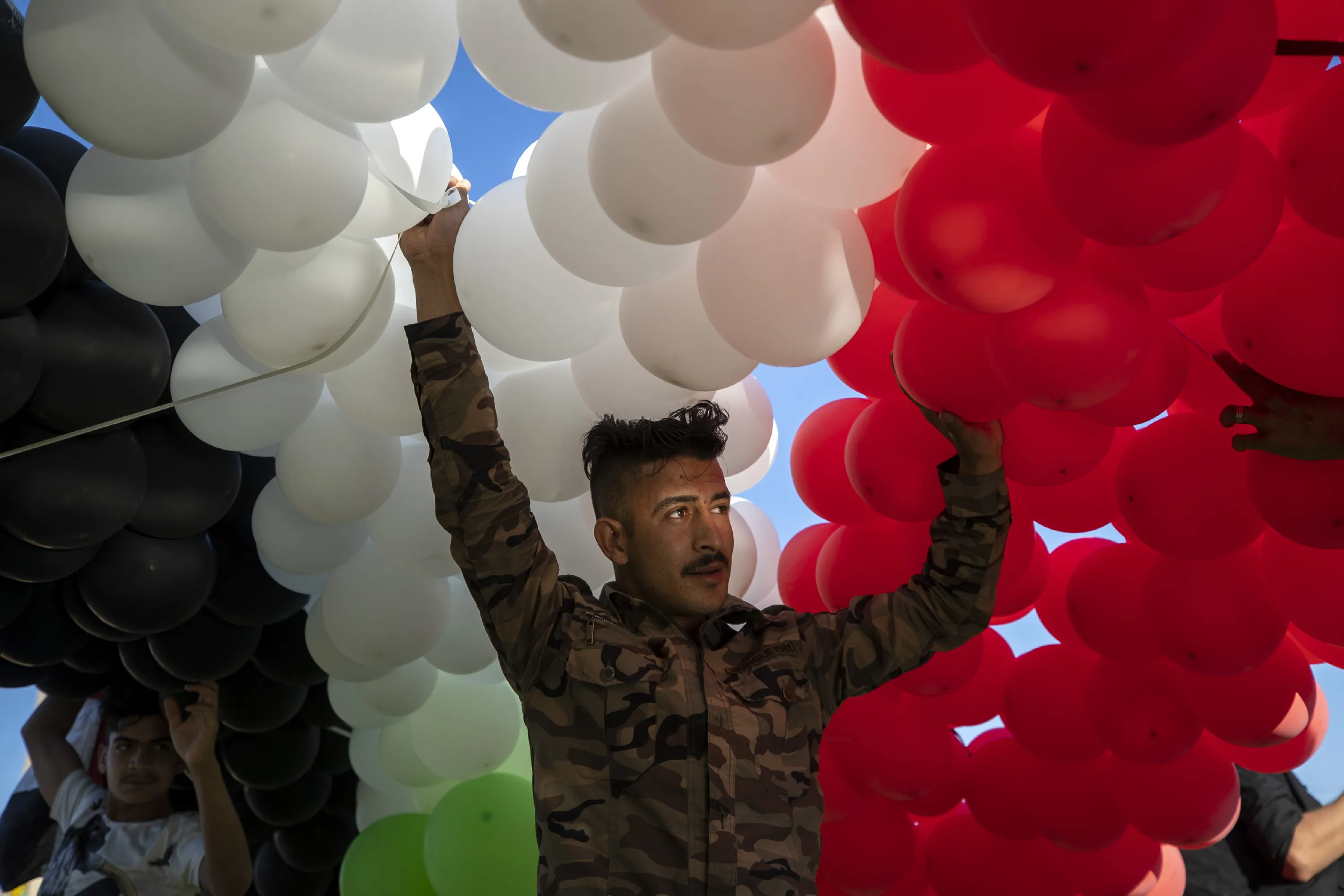 A supporter of Syrian President Bashar Assad prepares to release hundreds of balloons with the color of the Syrian flag at a gathering at Omayyid Square in the Syrian capital Damascus , Syria, Sunday, May 23, 2021. The presidential elections in the war-ravaged country will be held May 26. (Photo y Hassan Ammar/AP Photo)