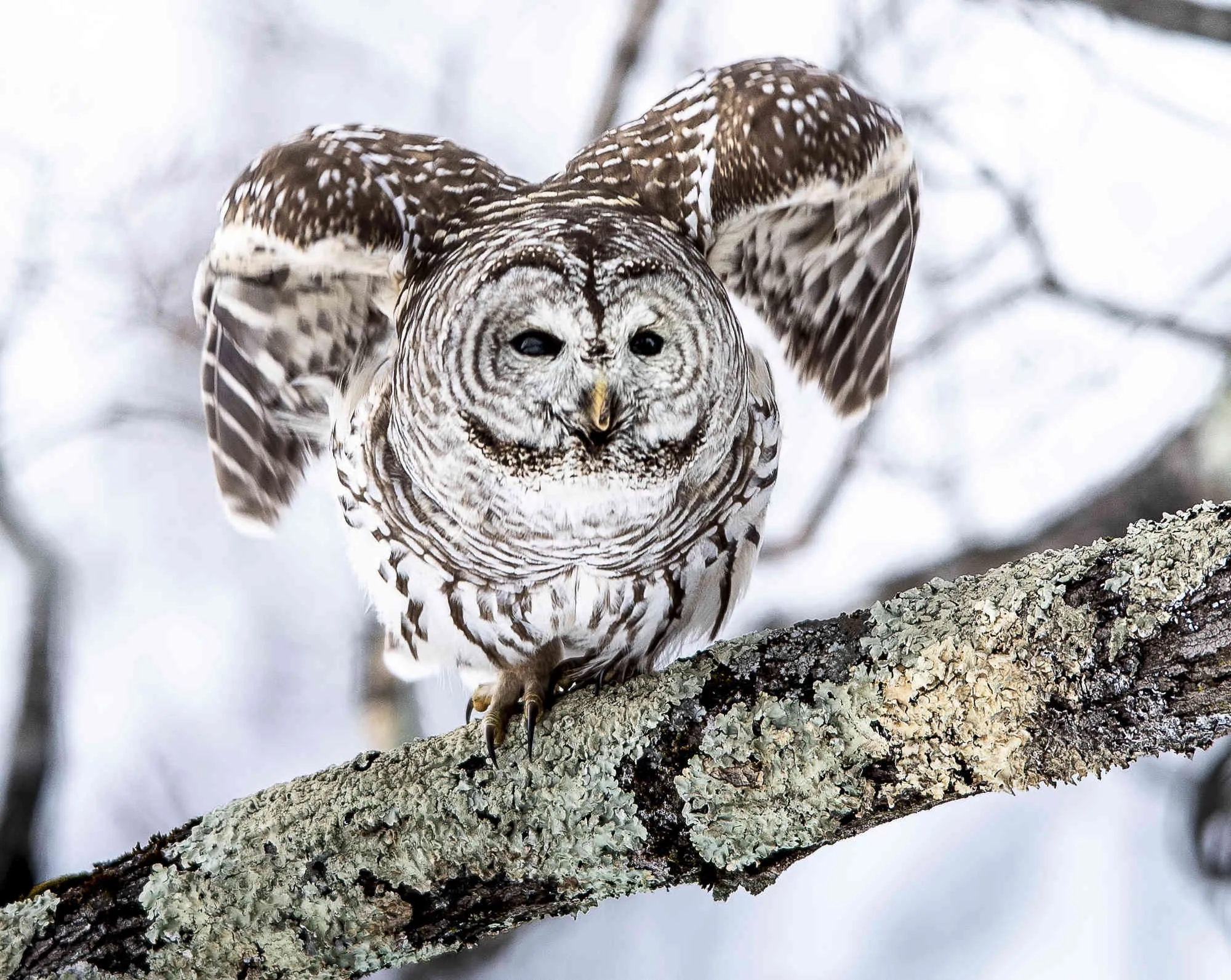 A barred owl with a broken beak takes flight from a branch along Line Road in Greene, Maine, Friday, January 28, 2022. According to Charity Bates who lives on the road, the owl has been in the area for several weeks and is abnormally active during the day. “We are not sure if it's a he or she, but we've named it Esther. She's quite a local celebrity as people stop every day to take photos and the school bus even slows down so the kids can take a look at her when they drive past”. said Bates. (Photo by Russ Dillingham/Sun Journal via AP Photo)