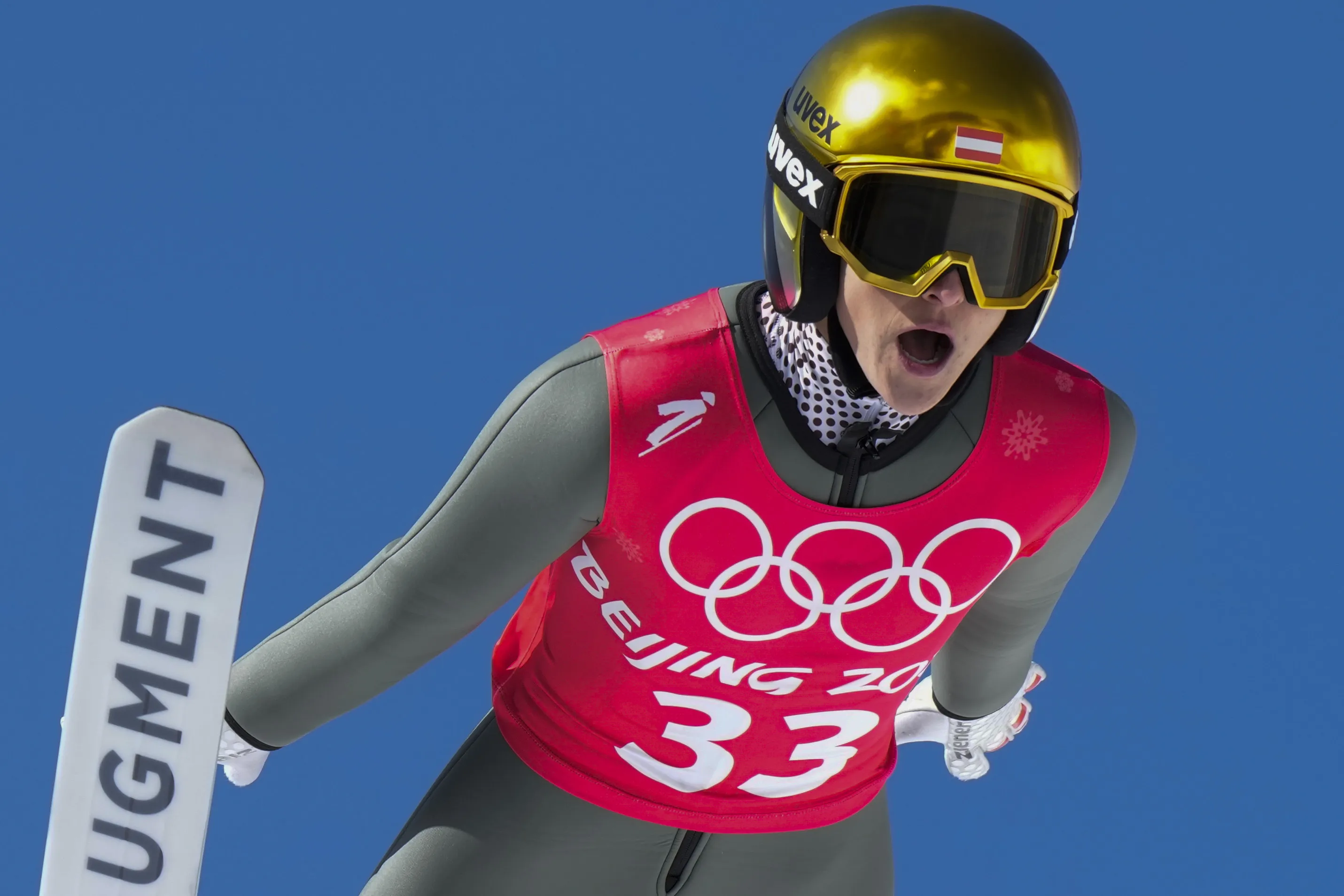 Eva Pinkelnig, of Austria, soars through the air during a women's normal hill ski jumping training session at the 2022 Winter Olympics, Friday, February 4, 2022, in Zhangjiakou, China. (Photo by Andrew Medichini/AP Photo)