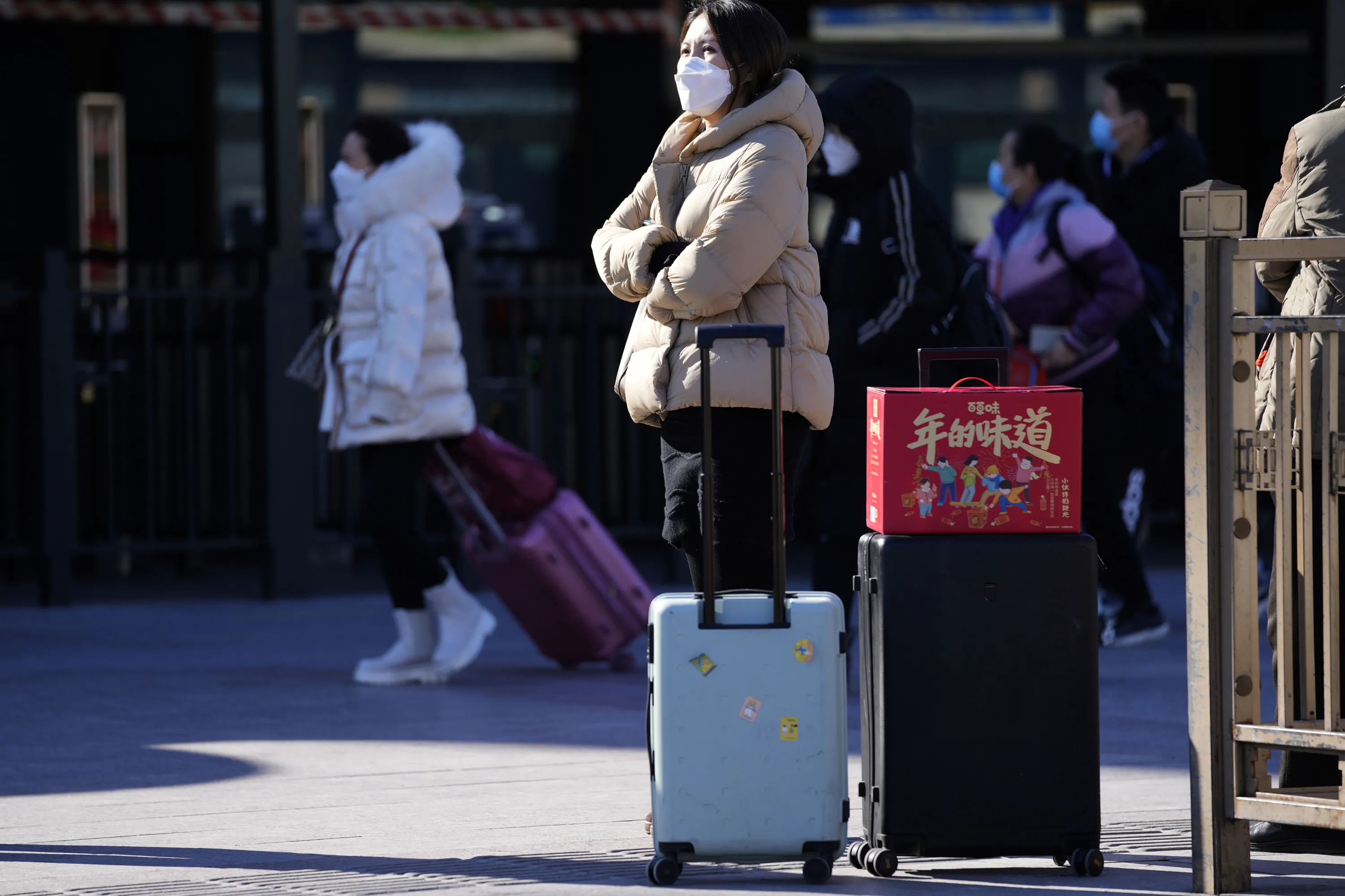A traveler waits outside the Beijing railway station with her trolley bags and a gift box with the words “The taste of New Year” in Beijing, China, Friday, January 28, 2022. (Photo by Ng Han Guan/AP Photo)