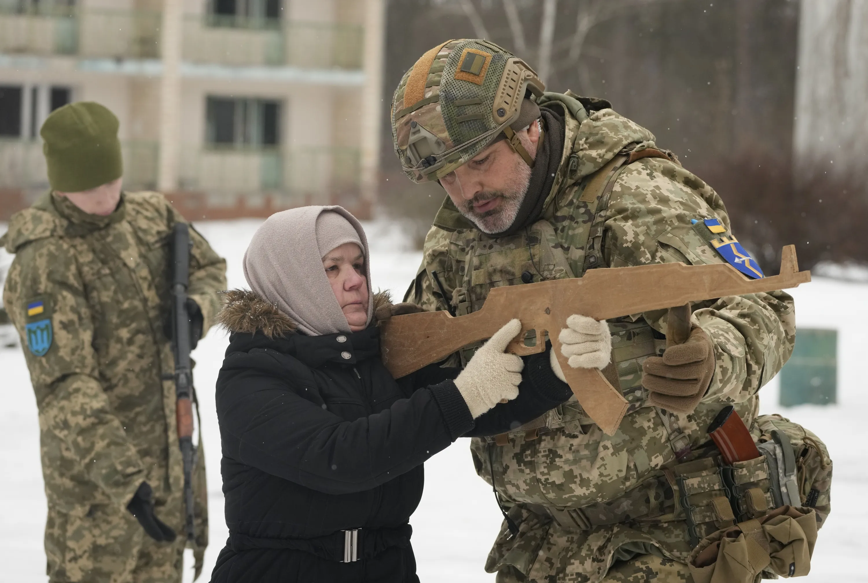 An instructor trains Rumia, 59, a member of Ukraine's Territorial Defense Forces, close to Kyiv, Ukraine, Saturday, February 5, 2022. Hundreds of civilians have been joining Ukraine's army reserves in recent weeks amid fears about a Russian invasion. (Photo by Efrem Lukatsky/AP Photo)