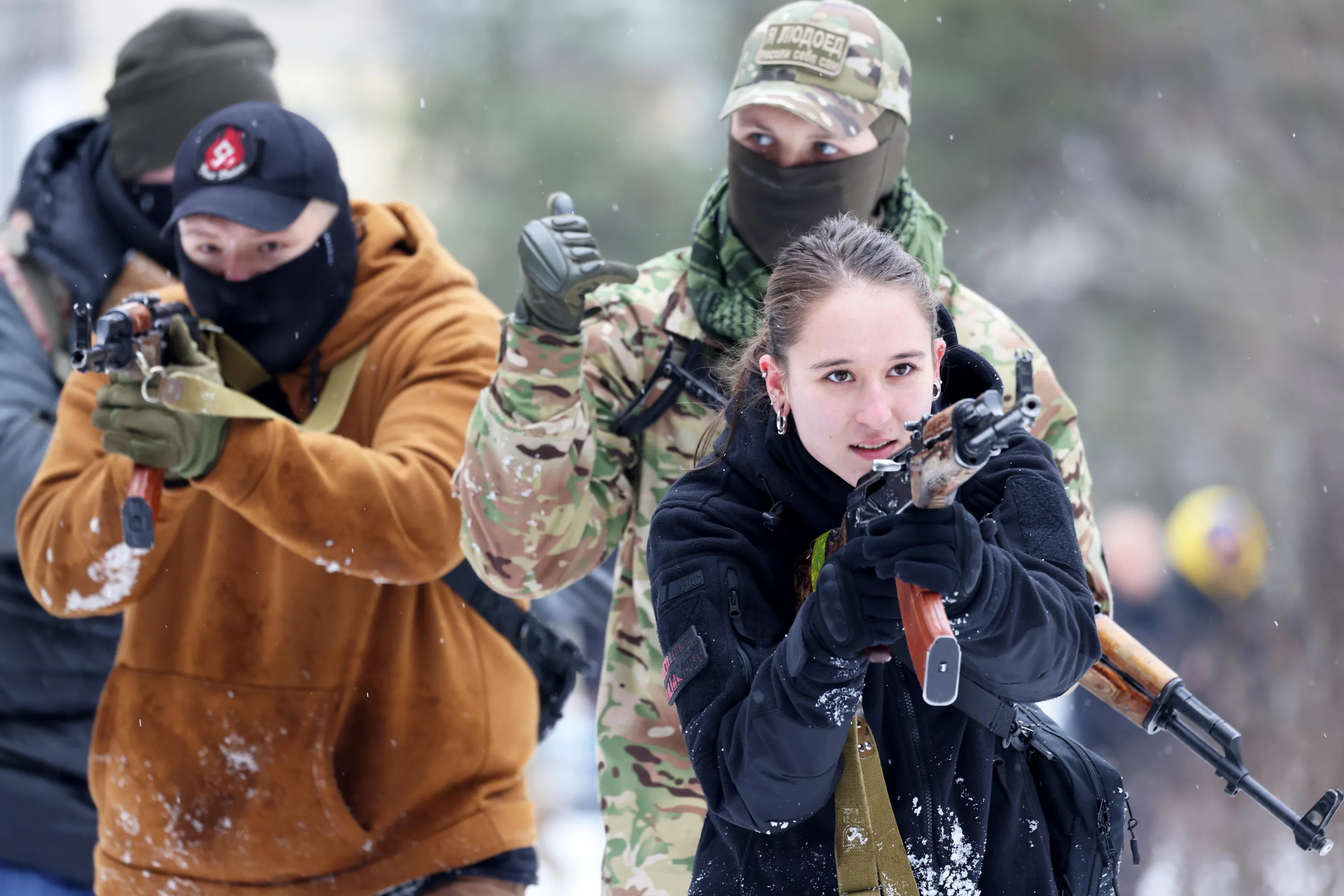 Members of Ukraine's Territorial Defense Forces, volunteer military units of the Armed Forces, train close to Kyiv, Ukraine, Saturday, February 5, 2022. (Photo by Doug Seeburg/The Sun)