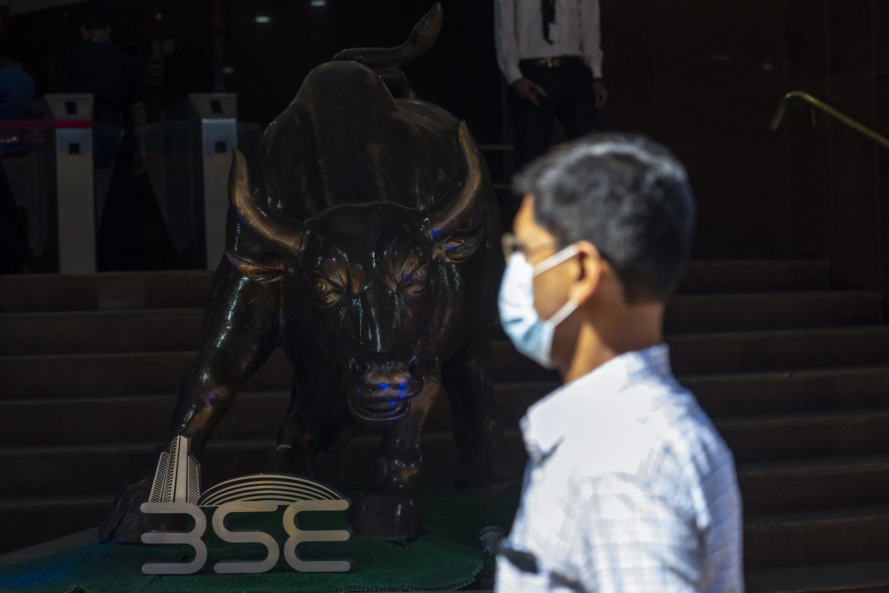 A man walks near a bronze statue of a bull outside the Bombay Stock Exchange (BSE) in Mumbai, India, Tuesday, February 1, 2022. Indian Prime Minister Narendra Modi's government on Tuesday announced a series of investments to shore up spending in infrastructure projects in its annual budget designed to spur growth and popularity just days ahead of key state elections. (Photo by Rafiq Maqbool/AP Photo)
