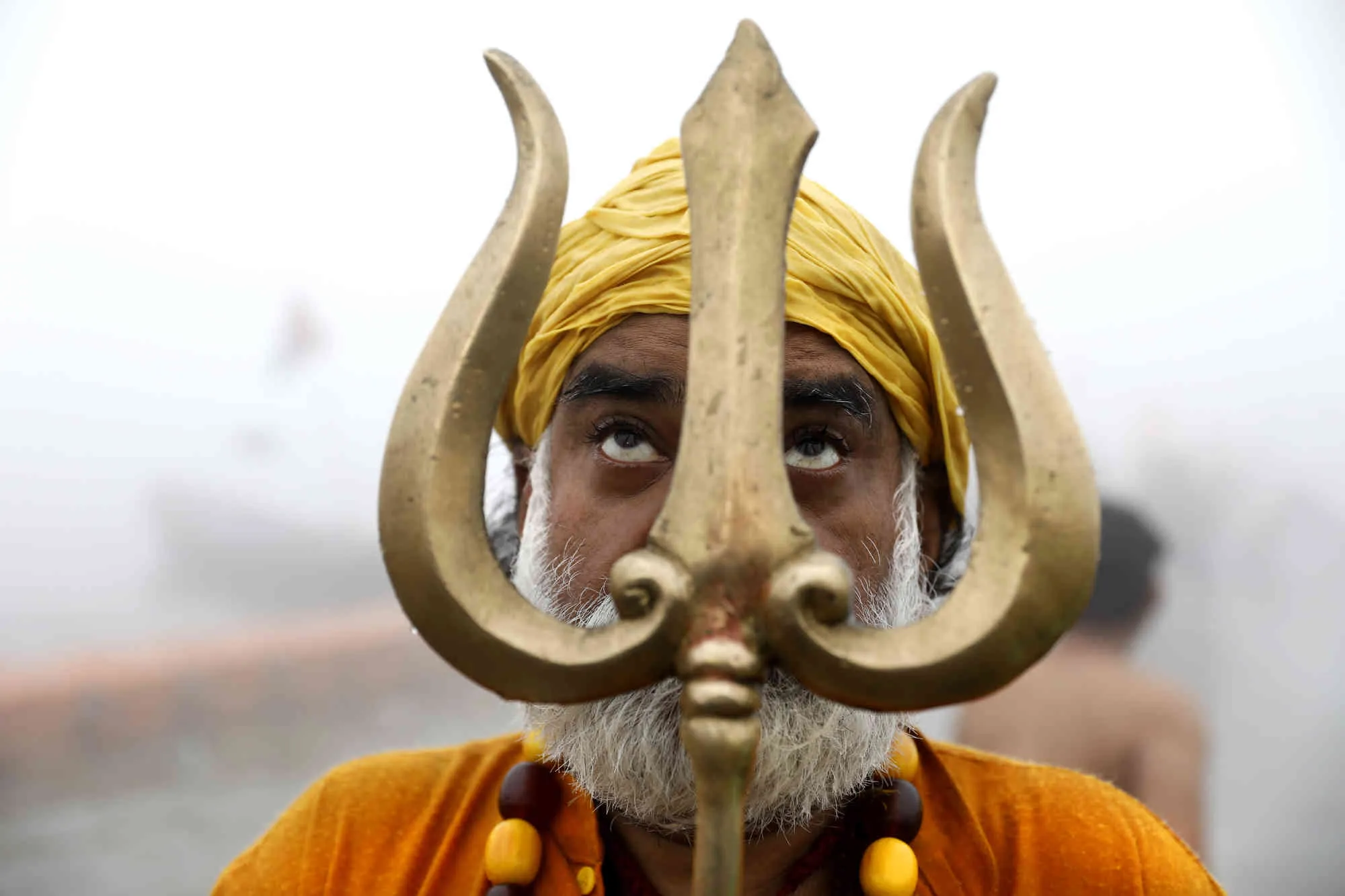 A Hindu pilgrim prays after taking a holy dip at Sangam, the confluence of the rivers Ganges and the Yamuna on “Mauni Amavasya” or new moon day, third and the most auspicious date of bathing day during the annual month long Hindu religious fair “Magh Mela” In Prayagraj, India. Tuesday, February 1, 2022. Hundreds of thousands of Hindu pilgrims take dips in the confluence, hoping to wash away sins during the month-long festival. (Photo by Rajesh Kumar Singh/AP Photo)