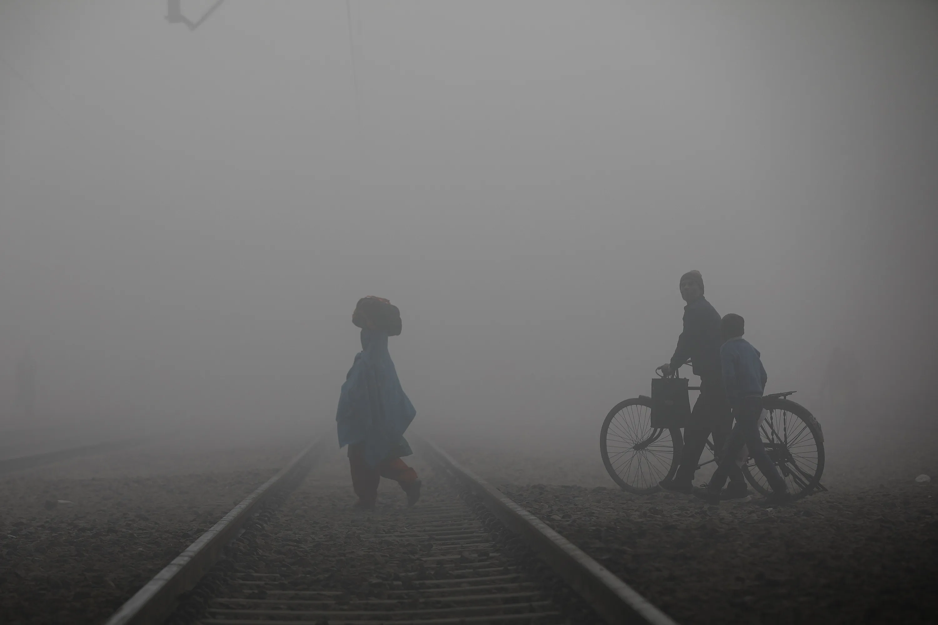 Indian people crosses a railway track on a foggy morning near a railway station in Ghaziabad, on the outskirts of New Delhi in India, February 01, 2022. The Indian government, meanwhile, presented the Union Budget for the next year, outlining the government spending and income while hoping to log a GDP growth of over 9%, which is highest among major economies. (Photo by Amarjeet Kumar Singh/Anadolu Agency via Getty Images)