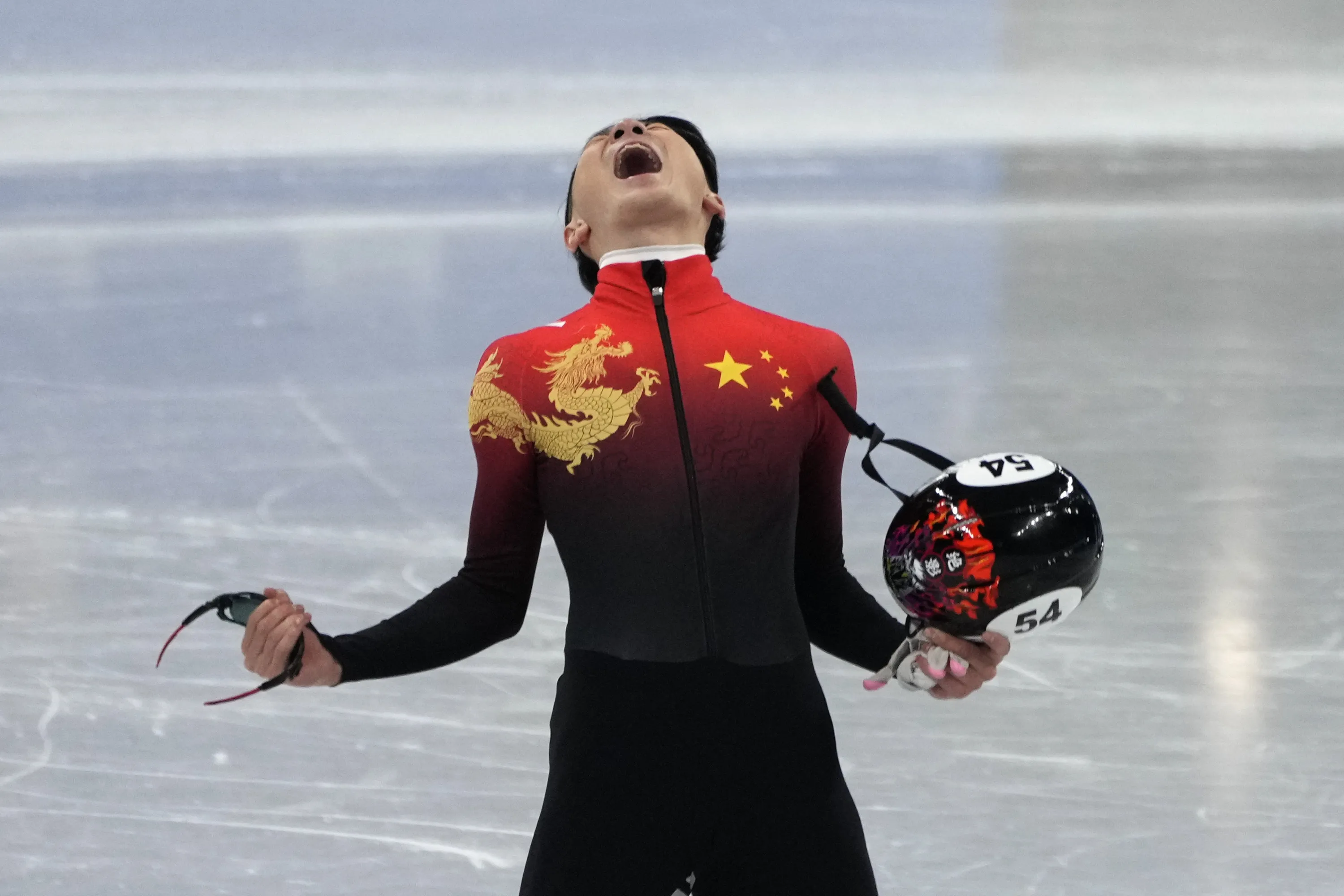 Ren Ziwei of China, celebrates after winning the men's 1,000-meter final during the short track speedskating competition at the 2022 Winter Olympics, Monday, February 7, 2022, in Beijing. (Photo by Natacha Pisarenko/AP Photo)