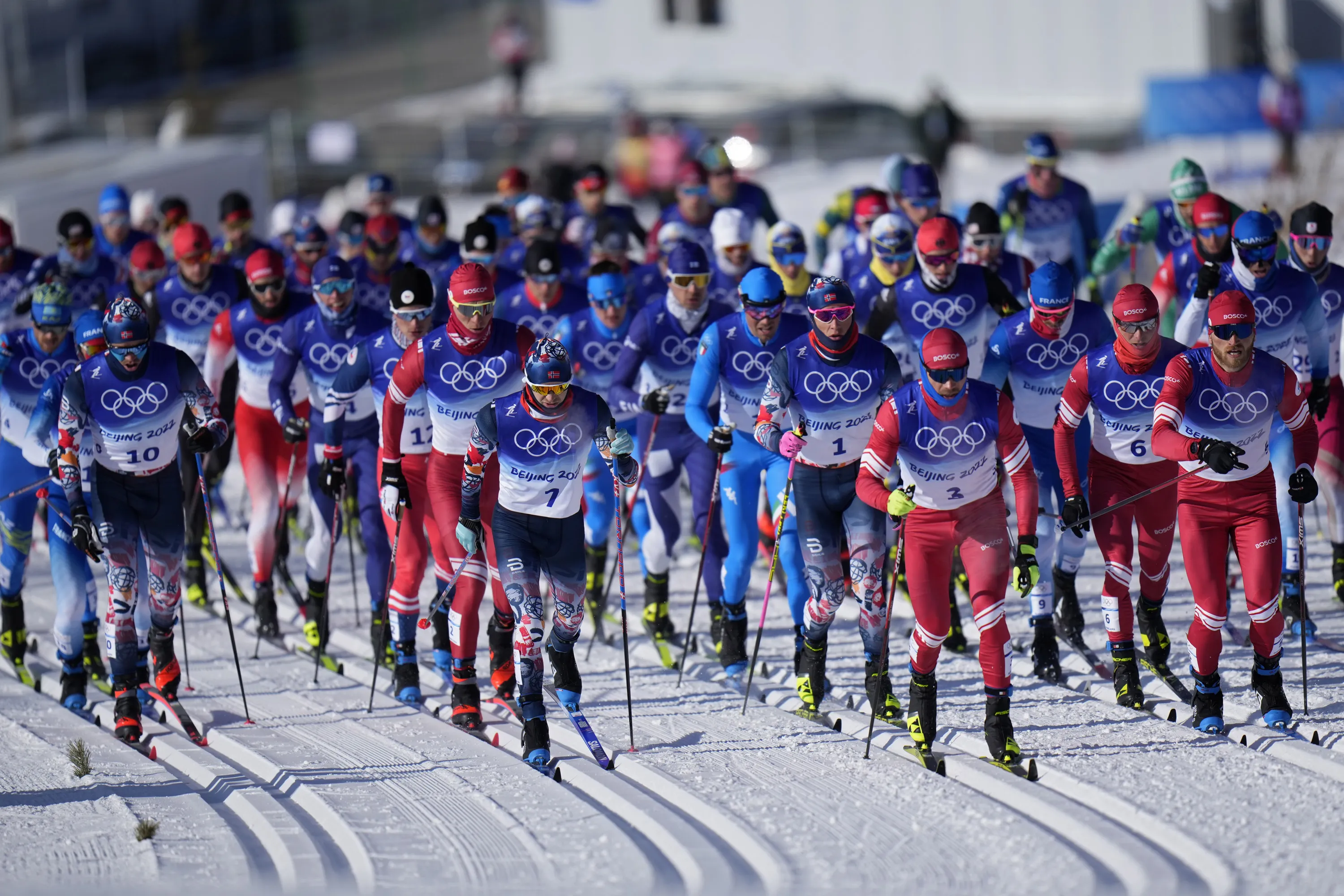Skiers compete during the men's 15km + 15km skiathlon cross-country skiing competition at the 2022 Winter Olympics, Sunday, February 6, 2022, in Zhangjiakou, China. (Photo by Alessandra Tarantino/AP Photo)