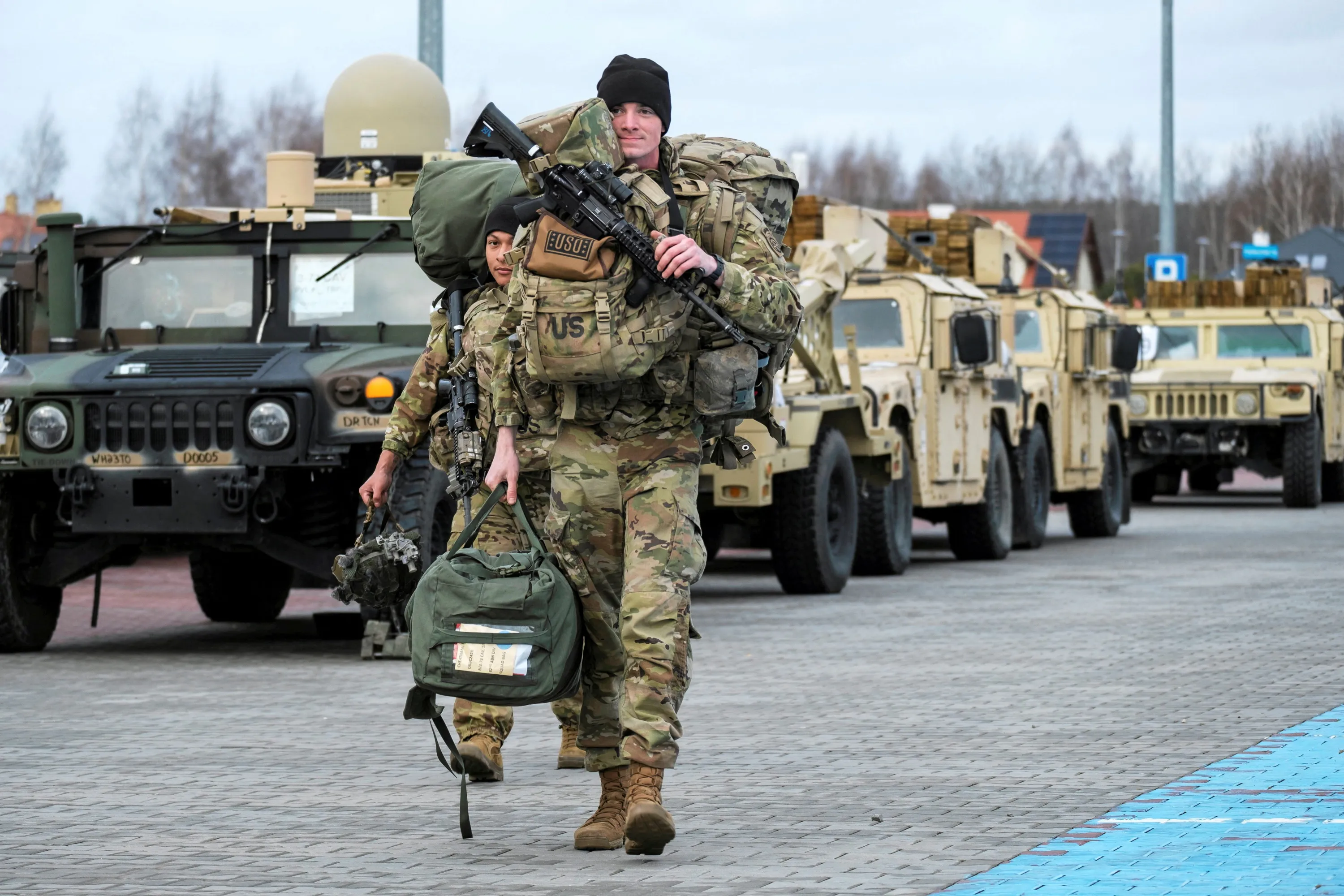 U.S. soldiers from the 82nd Airborne Division walk near the G2A Arena following their arrival at Rzeszow-Jasionka Airport, in Jasionka, Poland on February 8, 2022. (Photo by Patryk Ogorzalek/Agencja Wyborcza.pl via Reuters)