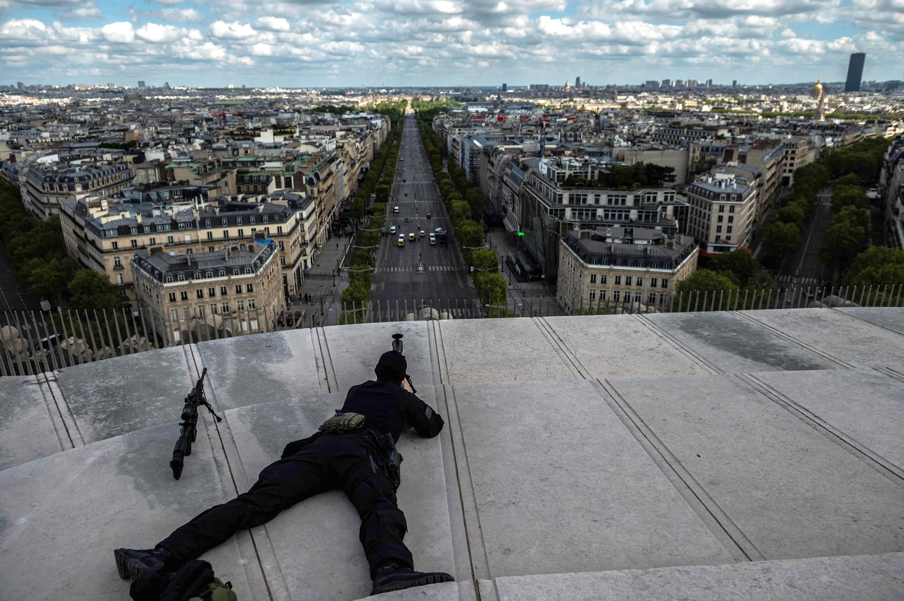 Snipers of the Brigade d'Intervention of the Police take their positions around the Arc de Triomphe to protect the ceremony of the 76th anniversary of Victory in Europe (VE-Day), marking the end of World War II in Europe, on May 8, 2021. (Photo by Martin Bureau/AFP Photo)