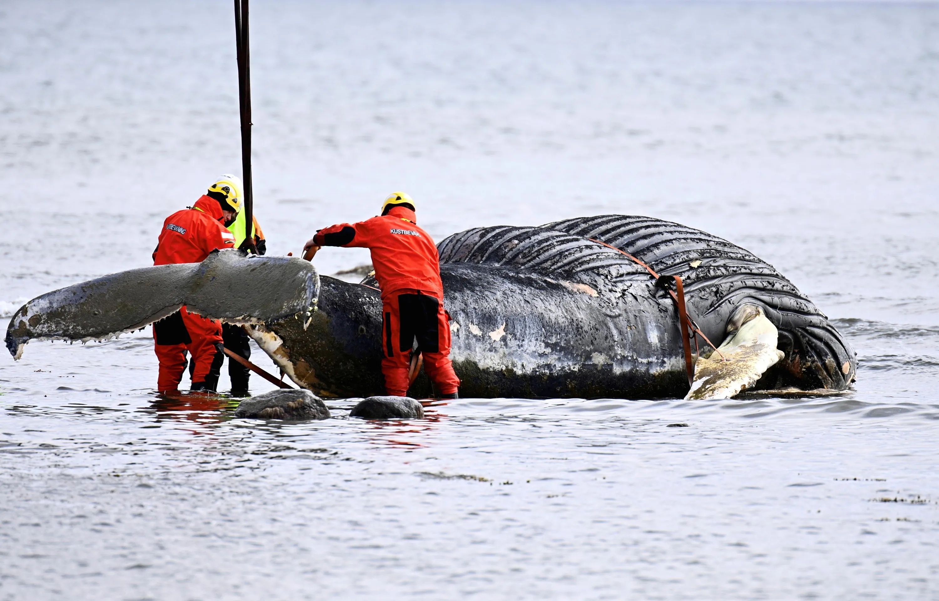 A young humpback whale stranded near Segerstad Lightohuse on Öland, outside Sweden's eastcoast, is being lifted out of the water and transported to an incineration facility, on May 3, 2021. (Photo by Suvad Mrkonjic/TT News Agency via AFP Photo)