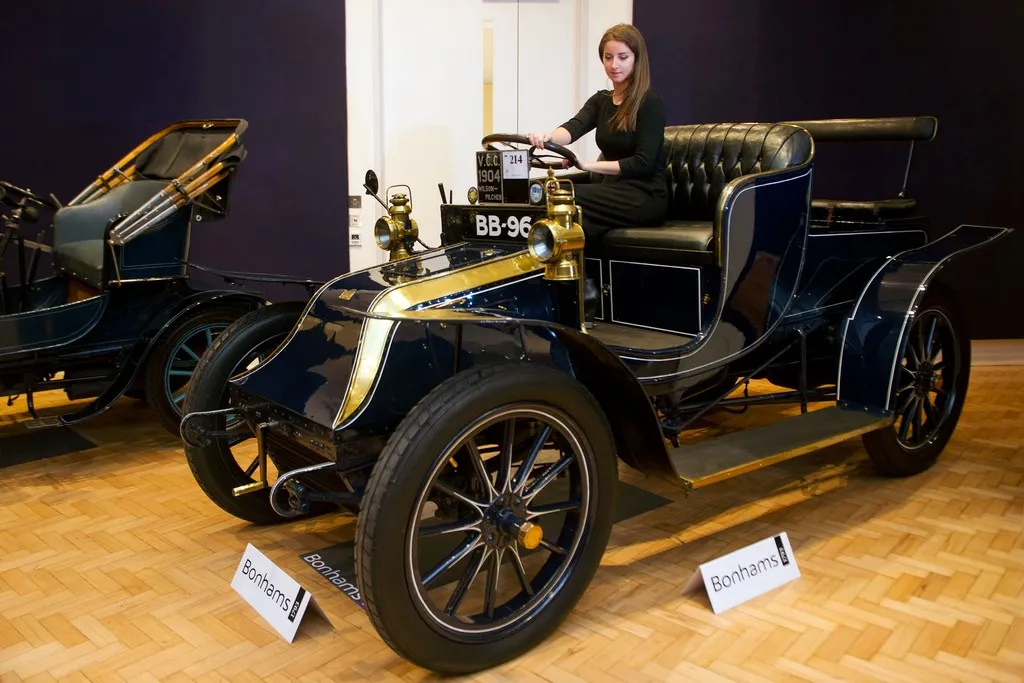 LONDON, ENGLAND - NOVEMBER 01: Bonhams employee, Sarah Gubbins sits in a 1904 Wilson-Pilcher, thought to be the oldest surviving example of its type on November 1, 2012 in London, England. The Car is part of a Veteran Car Sale at Bonhams and is valued at around 220,000 pounds (Photo by Bethany Clarke/Getty Images)