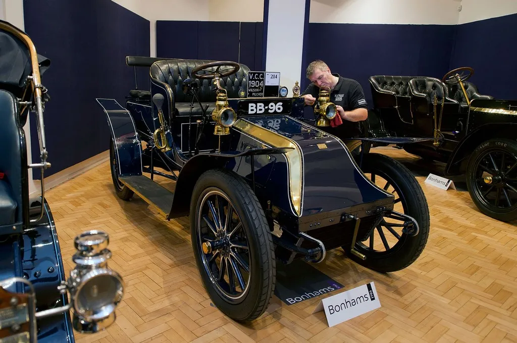LONDON, ENGLAND - NOVEMBER 01: Bonhams employee Craig Binns polishes a1904 Wilson-Pilcher, thought to be the oldest surviving example of its type on November 1, 2012 in London, England. The Car is part of a Veteran Car Sale at Bonhams and is valued at around 220,000 pounds (Photo by Bethany Clarke/Getty Images)