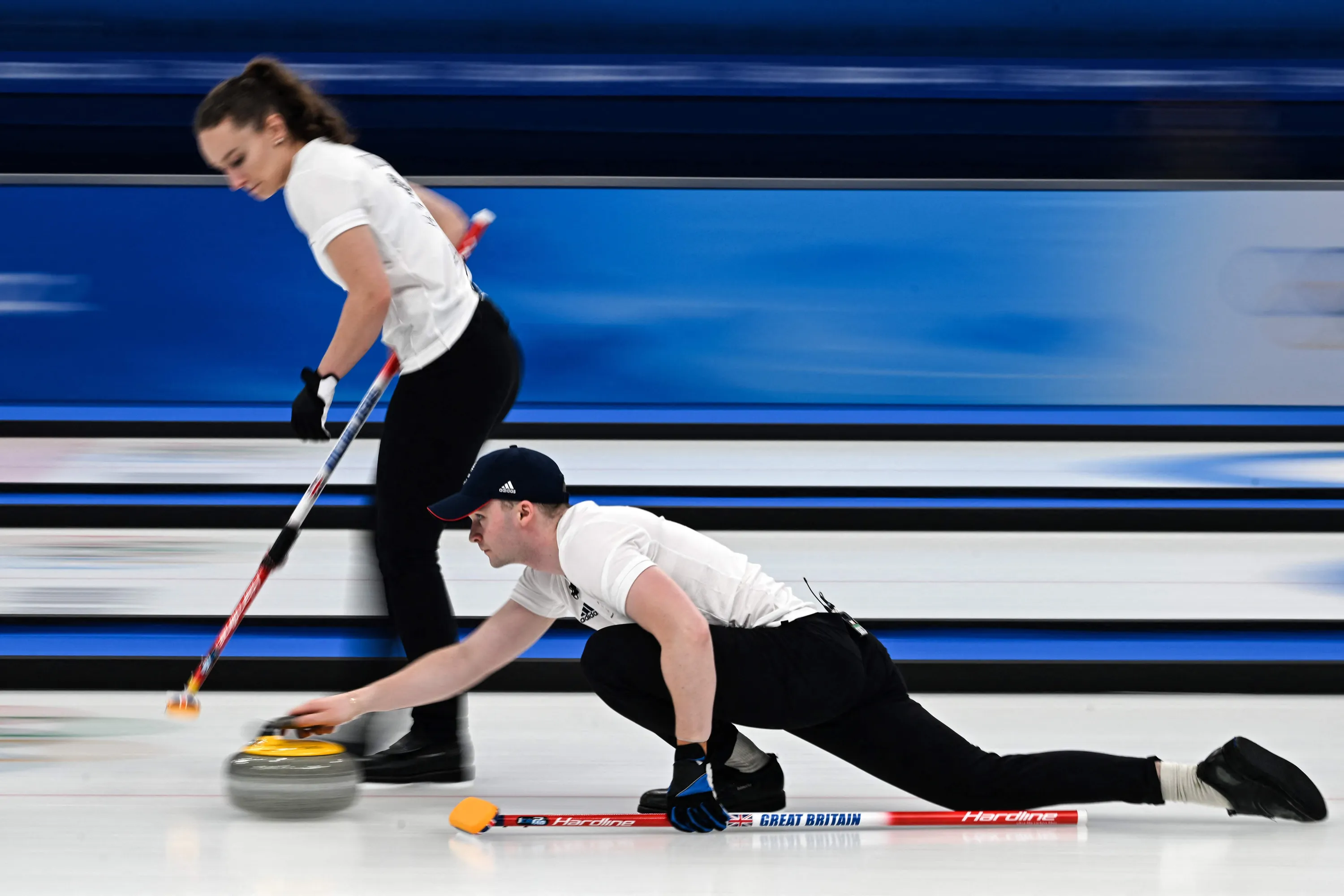 Britain's Jennifer Dodds and Britain's Bruce Mouat (R) curl the stone during the mixed doubles bronze medal game of the Beijing 2022 Winter Olympic Games curling competition between Sweden and Britain, at the National Aquatics Centre in Beijing on February 8, 2022. (Photo by Lillian Suwanrumpha/AFP Photo)