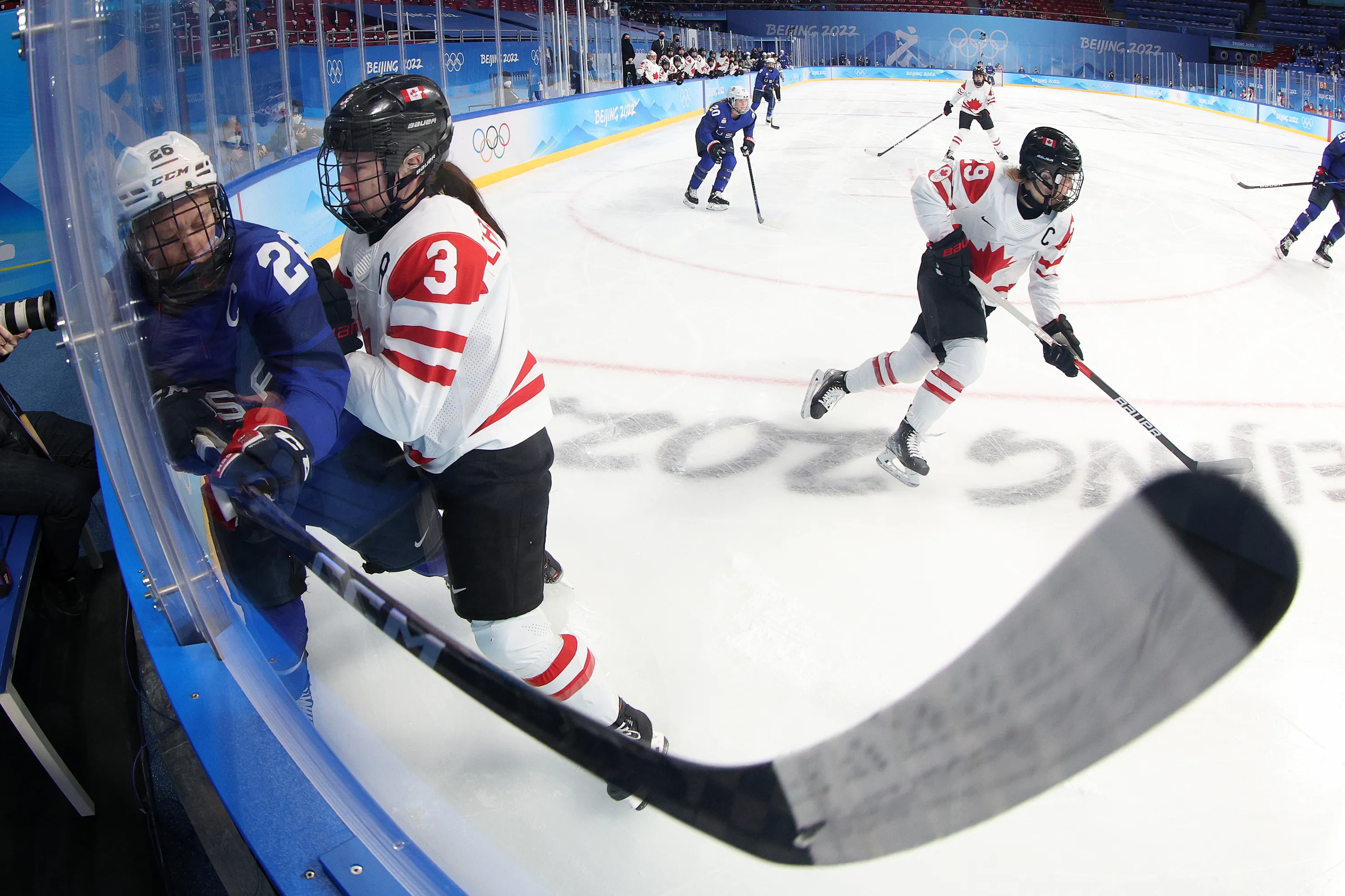 Jocelyne Larocque #3 of Team Canada checks Kendall Coyne Schofield #26 of Team United States in the corner boards in the first period during the Group A Women's Preliminary Round ice hockey match between Team United States and Team Canada at Wukesong Sports Centre on February 08, 2022 in Beijing, China. (Photo by Bruce Bennett/Getty Images)