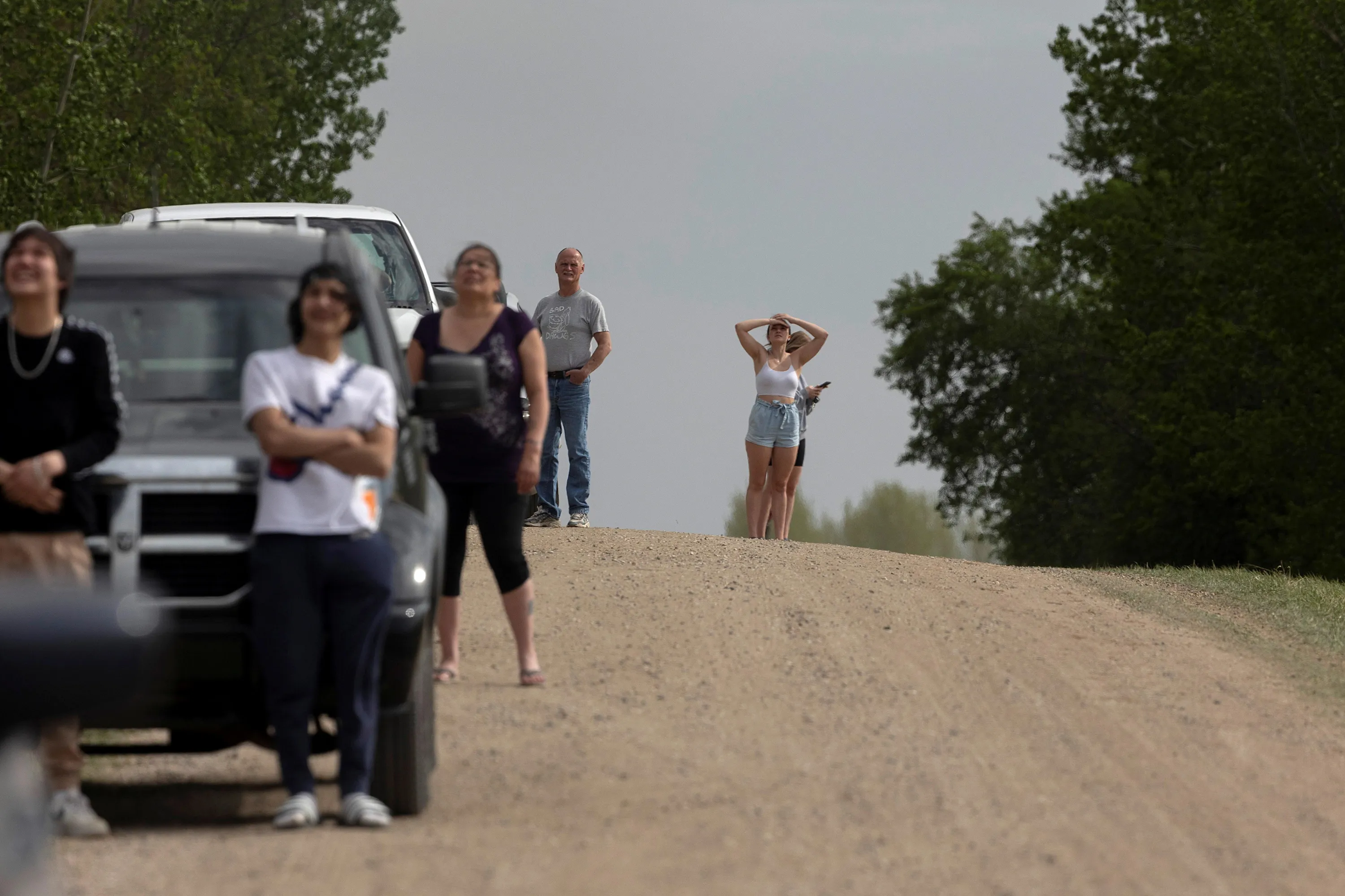 People watch the smokey skyline after the city of Prince Albert declared a state of emergency over a fast-moving wildfire, prompting some residents to evacuate, in Prince Albert, Saskatchewan, Canada on May 18, 2021. (Photo by David Stobbe/Reuters)