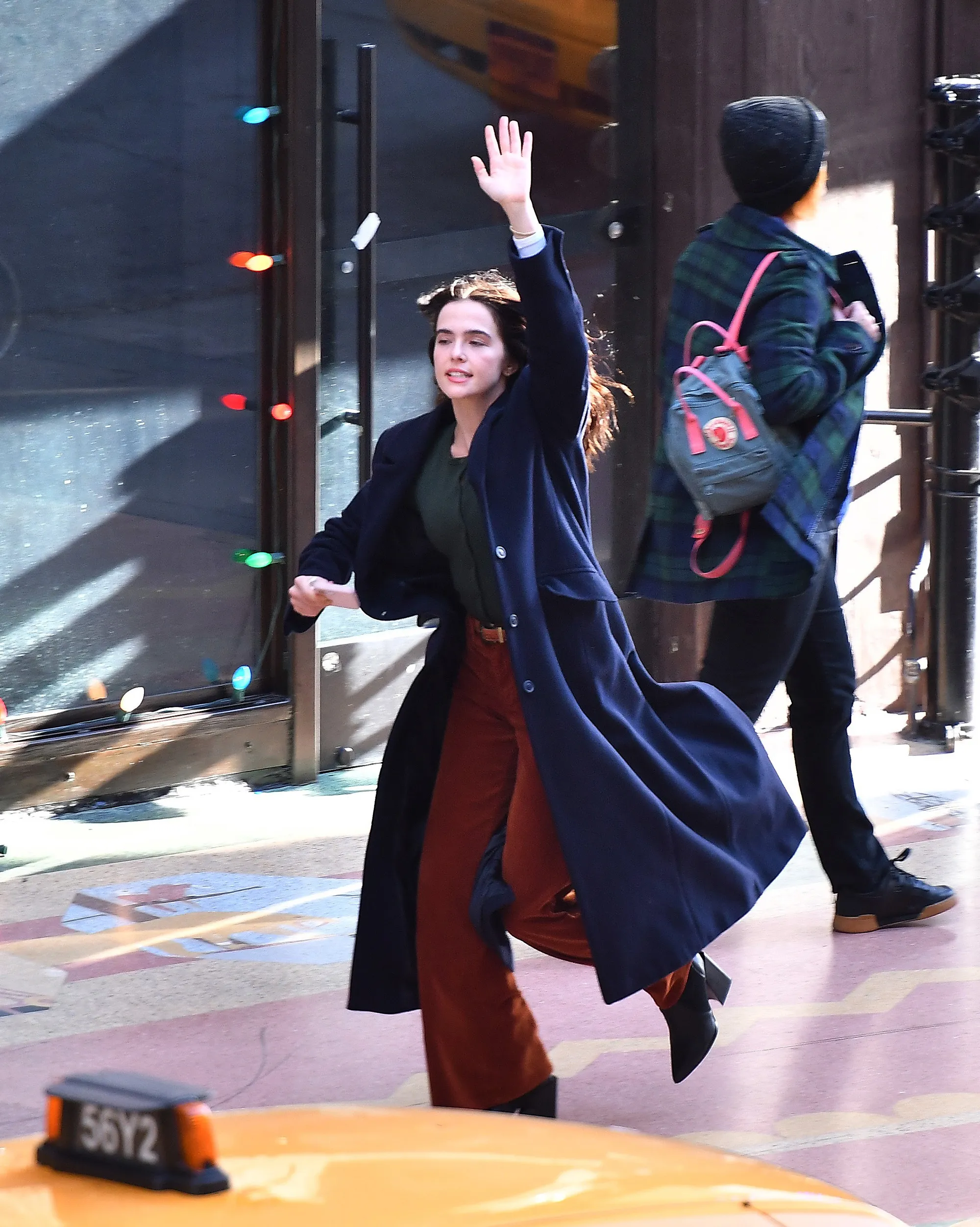 American actress Zoey Deutch is spotted filming an untitled project in downtown Los Angeles on February 3, 2022. The 27 year old actress chased a yellow taxi while wearing a blue trench coat, green top, rust corduroy trousers, and black heels. (Photo by The Image Direct)