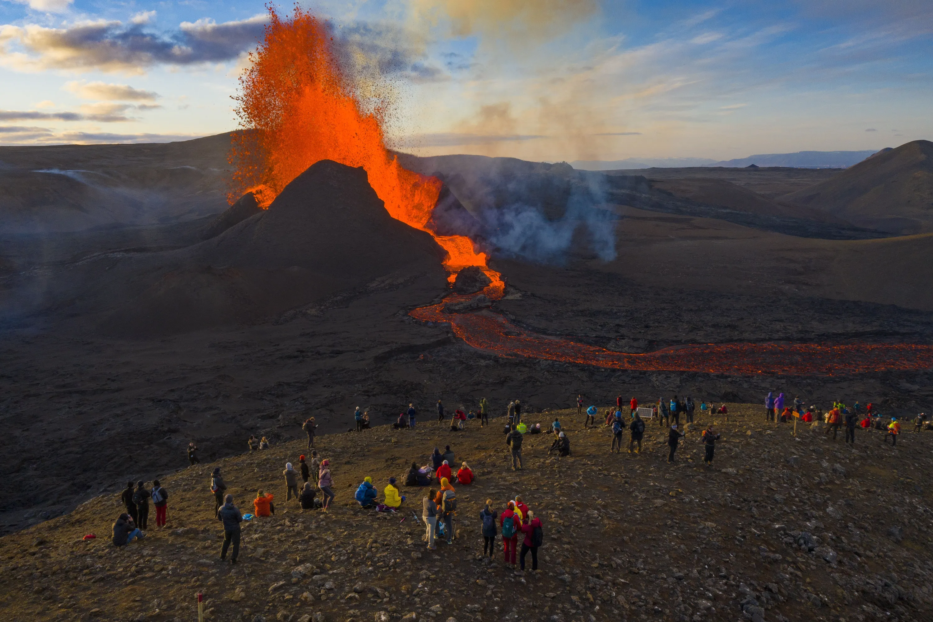 People watch as lava flows from an eruption from the Fagradalsfjall volcano on the Reykjanes Peninsula in southwestern Iceland on Tuesday, May 11, 2021. The glow from the bubbling hot lava spewing out of the Fagradalsfjall volcano can be seen from the outskirts of Iceland's capital, Reykjavík, which is about 32 kilometers (20 miles) away. Pandemic or no pandemic, the world will never stand still. That's perhaps no clearer than in Iceland where the Fagradalsfjall volcano has awoken from a slumber that has lasted 6,000 years, give or take a year or two. (Photo by Miguel Morenatti/AP Photo)