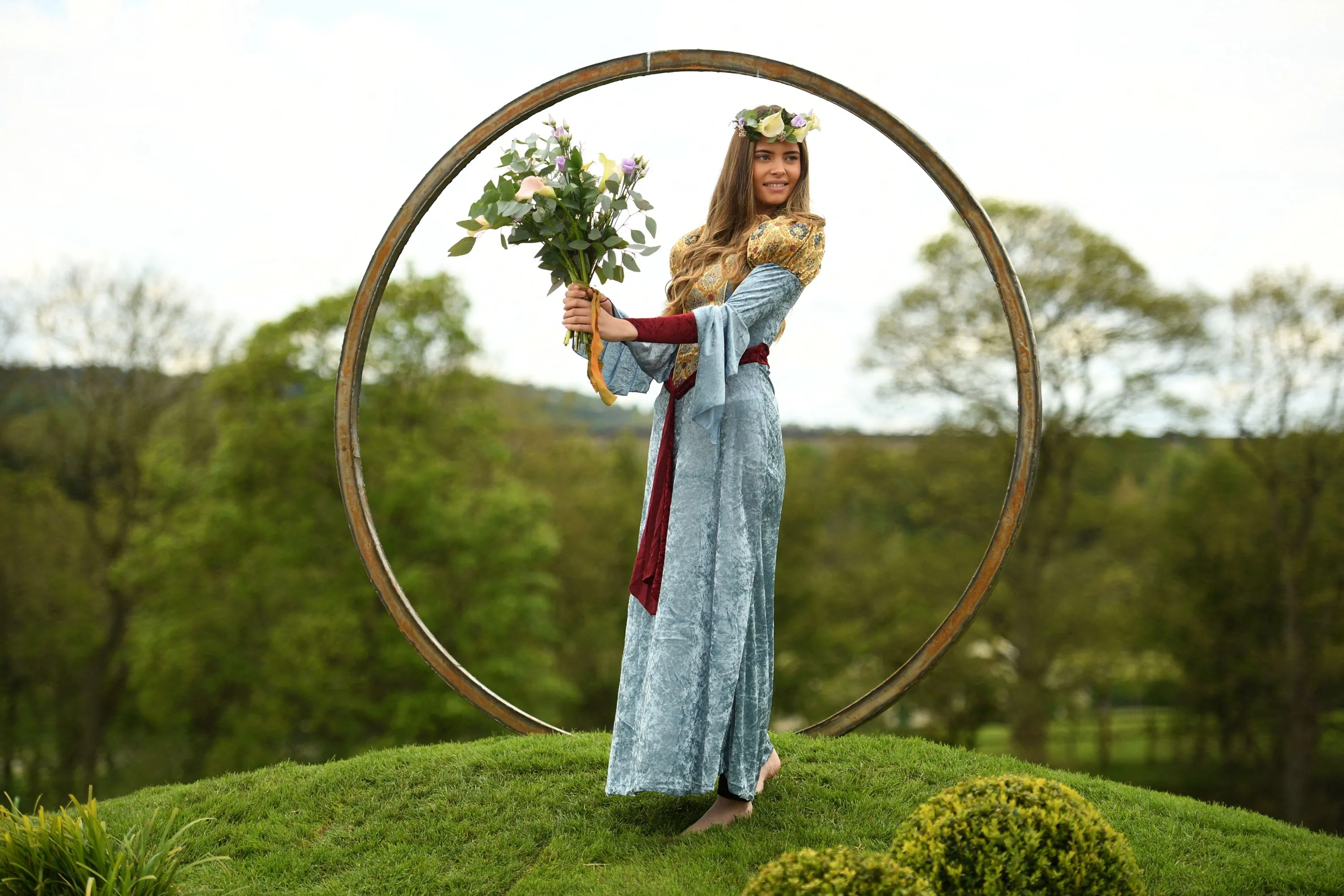 Model Freya Lee, dressed as the Lady of Shalott, poses for a photograph in the “Escape your mind” show garden during a photocall to promote the Harrogate Spring Flower Show at the Great Yorkshire Showground in Harrogate, northern England on May 19, 2021. (Photo by Oli Scarff/AFP Photo)