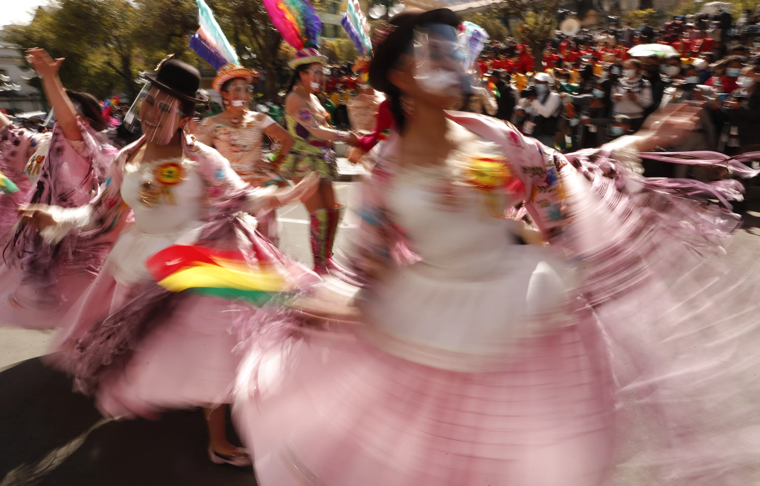 Dancers perform La Morenada, or Dance of the Black Slaves, in Plaza Murillo in La Paz, Bolivia, Tuesday, May 18, 2021. Dancers gathered in defense of the traditional dance they say is part of the Bolivian cultural heritage which was recently claimed by the Peruvian city Puno, causing a diplomatic row. (Photo by Juan Karita/AP Photo)