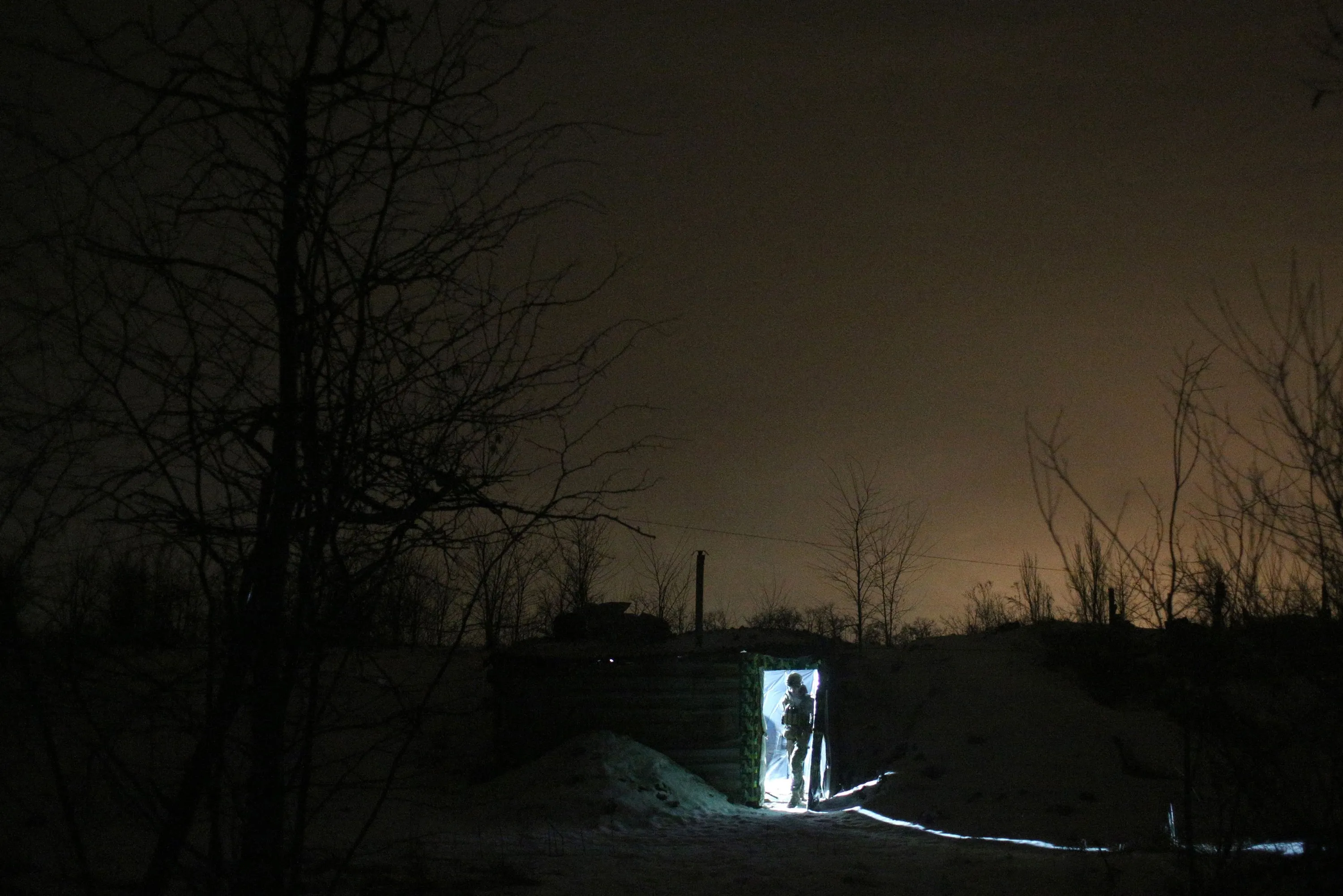 An Ukrainian soldier leaves a shelter on the frontline with the Russia-backed separatists near the village of Verkhnetoretskoye, Donetsk region, on February 1, 2022. (Photo by Anatolii Stepanov/AFP Photo)