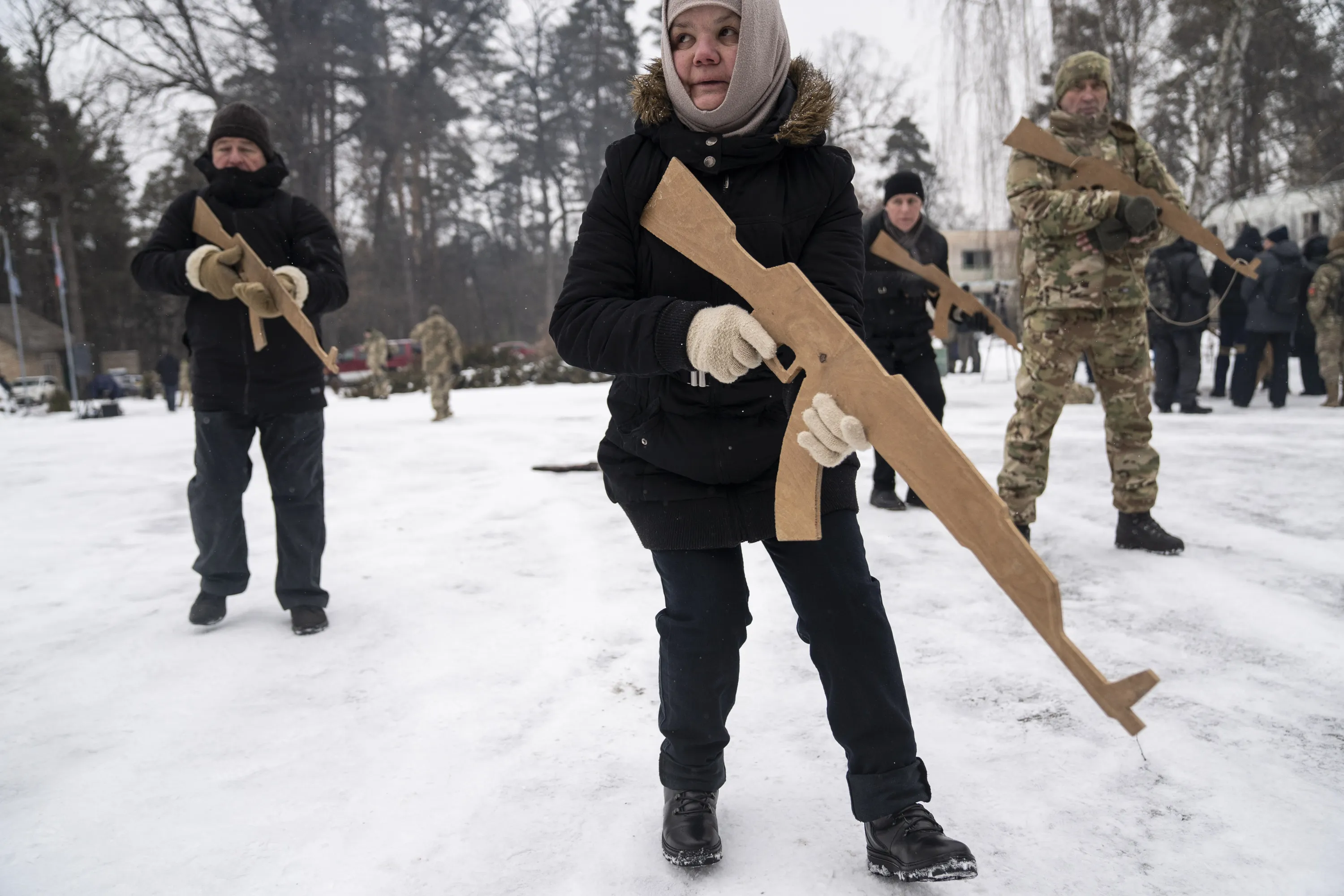 Rumiya Romanenko, 59, trains with a wooden rifle during a training session at an abandoned youth center on February 5, 2022 in the outskirts of Kyiv, Ukraine. (Photo by Michael Robinson Chavez/The Washington Post)
