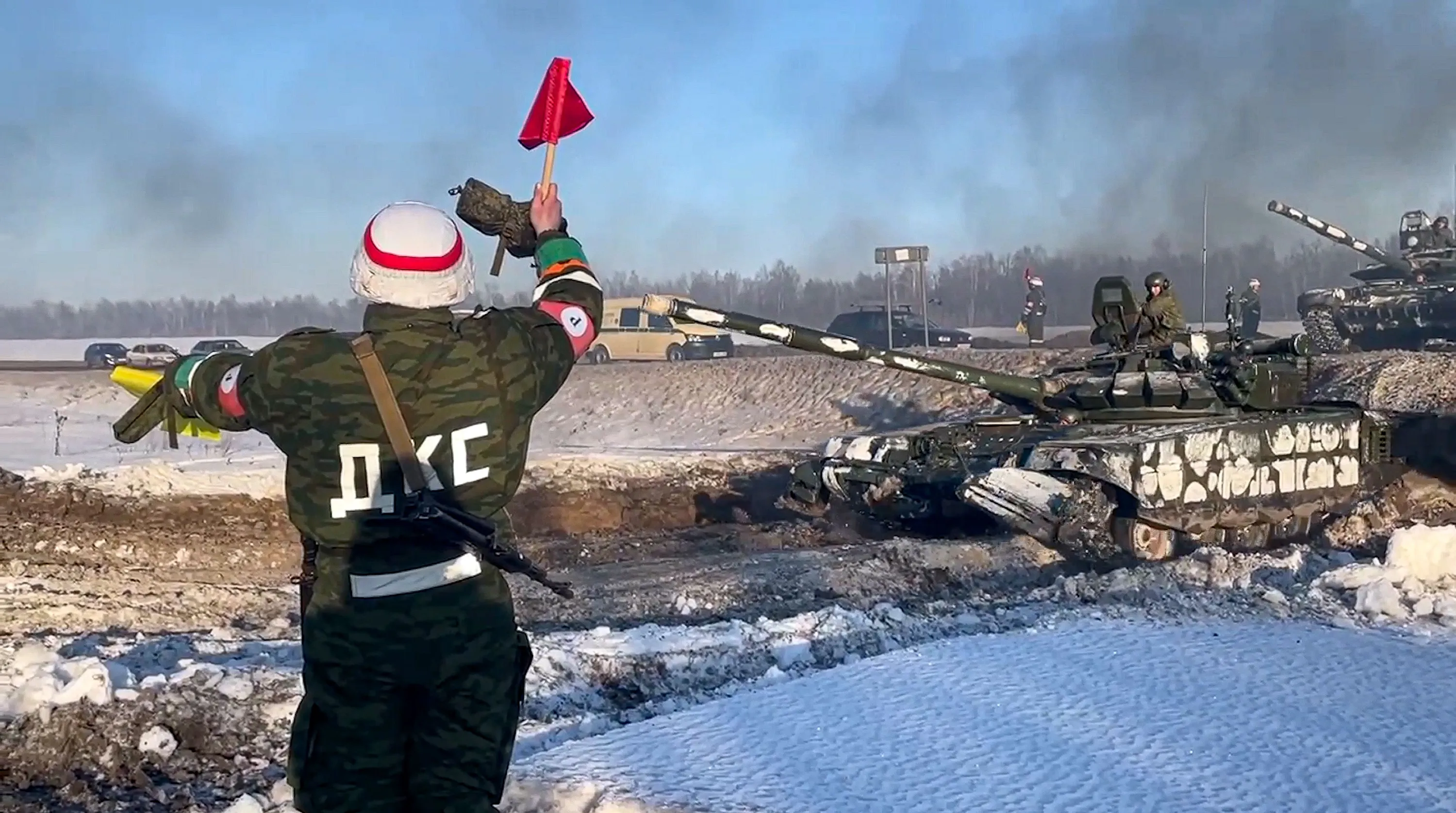 In this photo taken from video provided by the Russian Defense Ministry Press Service on Tuesday, February 15, 2022, Russian army tanks move back to their permanent base after drills in Russia. In what could be another sign that the Kremlin would like to lower the temperature, Russia's Defense Ministry announced Tuesday that some units participating in military exercises would begin returning to their bases. (Photo by Russian Defense Ministry Press Service via AP Photo)