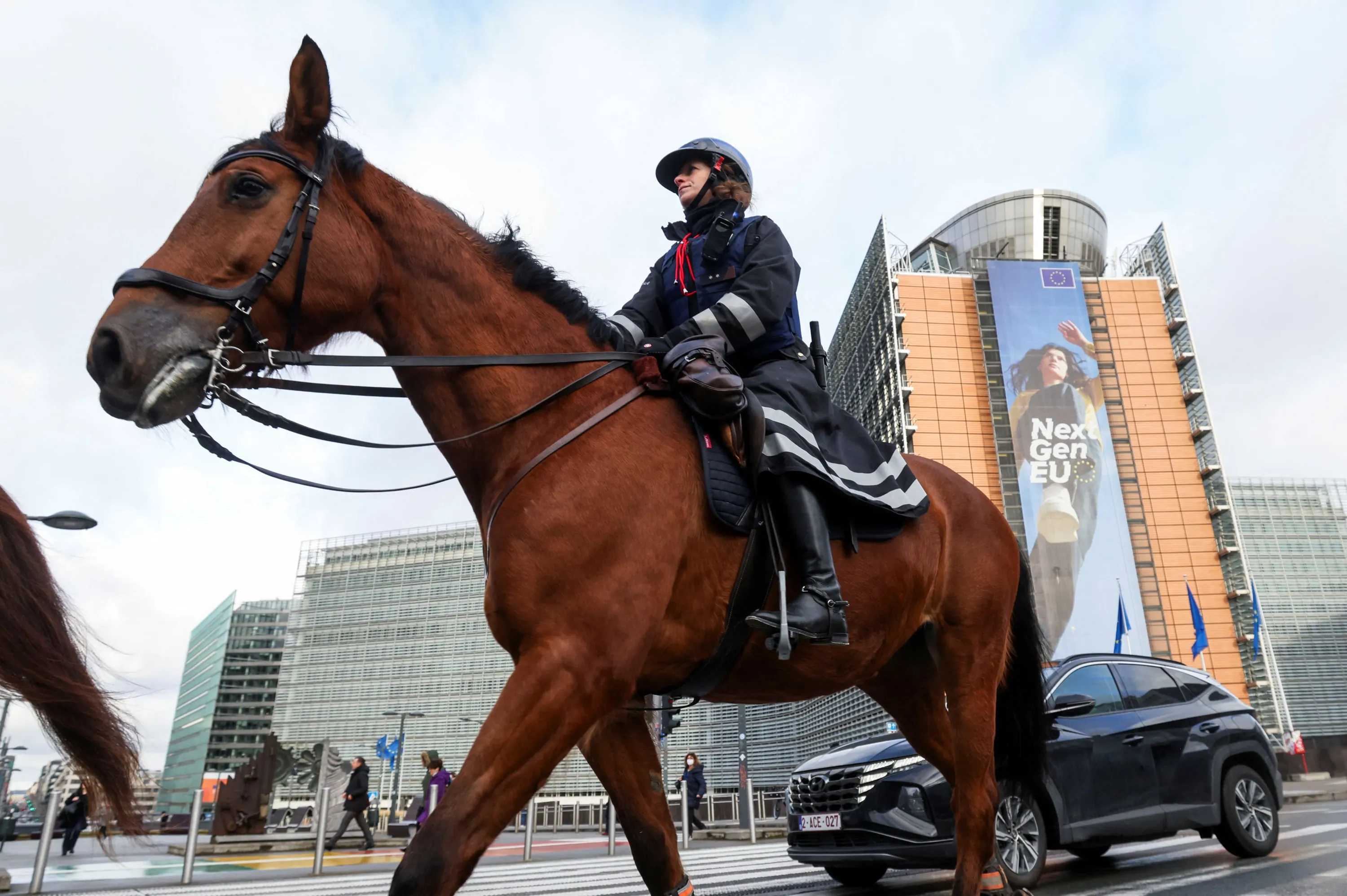 Mounted police officers patrol near the EU institutions buildings ahead of a potential protest against coronavirus disease (COVID-19) restrictions called “Convoi Europeen de la Liberte 2022” (“European Freedom Convoy 2022”), in Brussels, Belgium on February 14, 2022. (Photo by Yves Herman/Reuters)