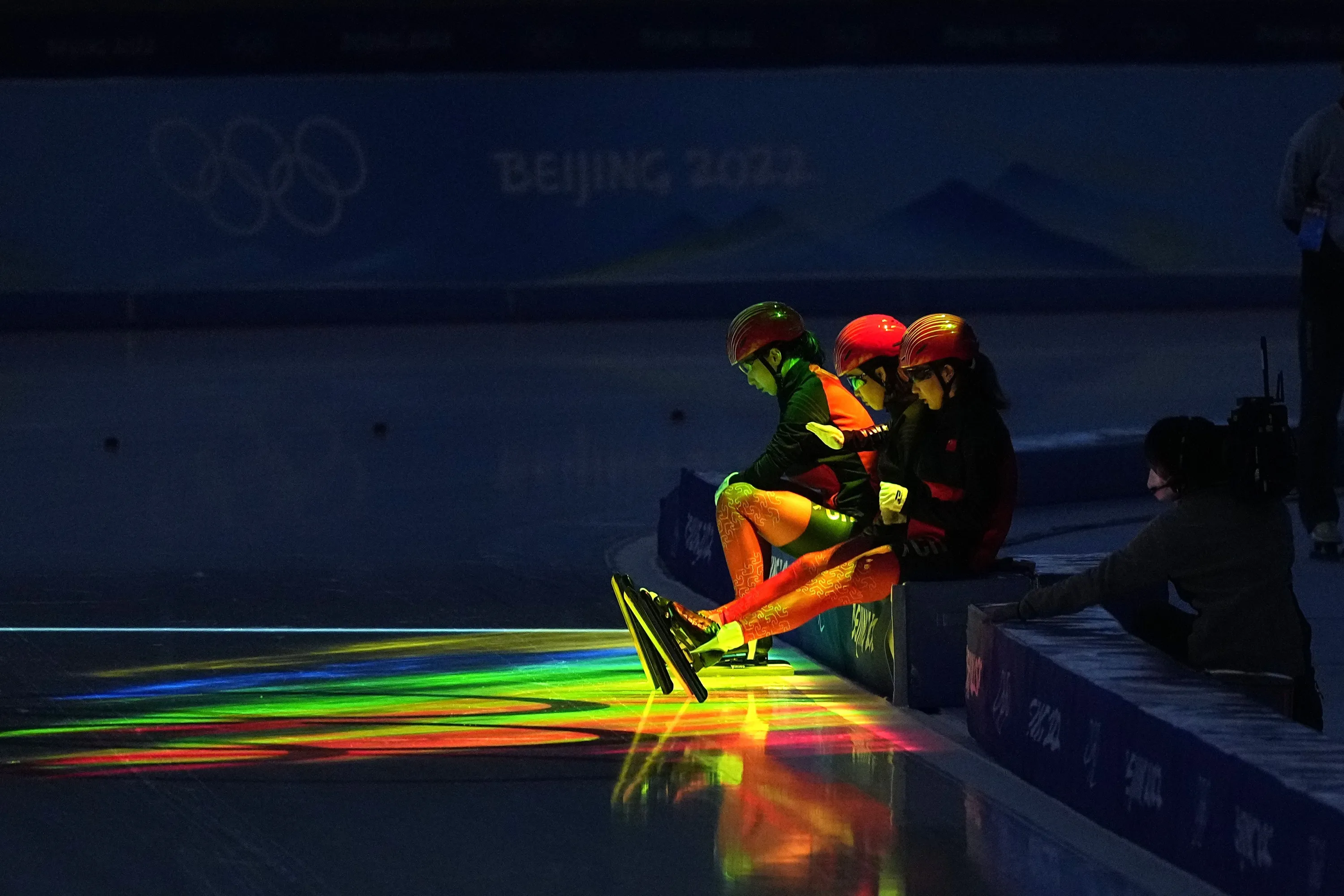 Team China readies to compete in the speedskating women's team pursuit quarterfinals at the 2022 Winter Olympics, Saturday, February 12, 2022, in Beijing. (Photo by Sue Ogrocki/AP Photo)