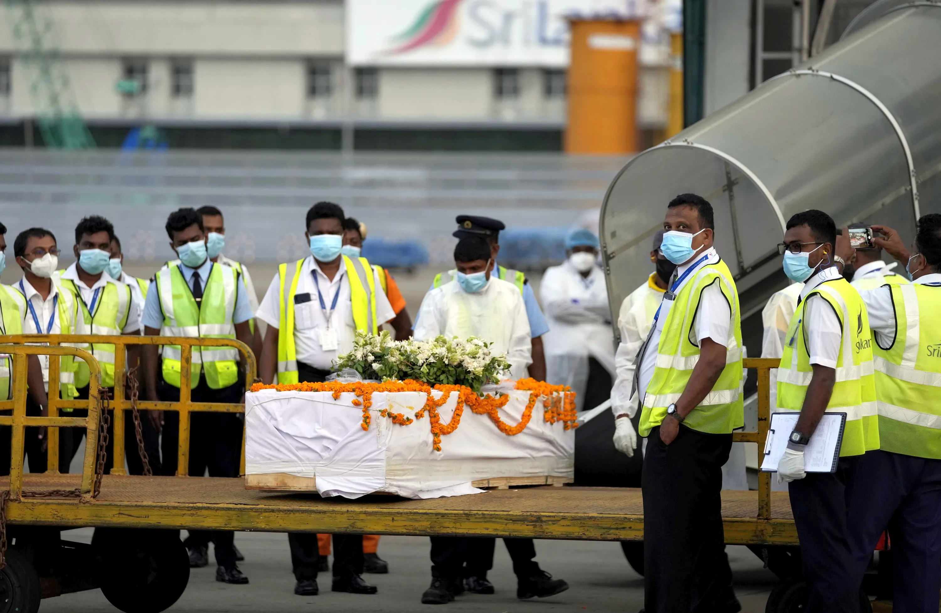 Sri Lankan air port workers stand next to a casket carrying remains of Priyantha Kumara, a Sri Lankan employee who was lynched by a Muslim mob in Sialkot last week after unloading it from an aircraft in Colombo, Sri Lanka, Monday, December 6, 2021. (Photo by Eranga Jayawardena/AP Photo)