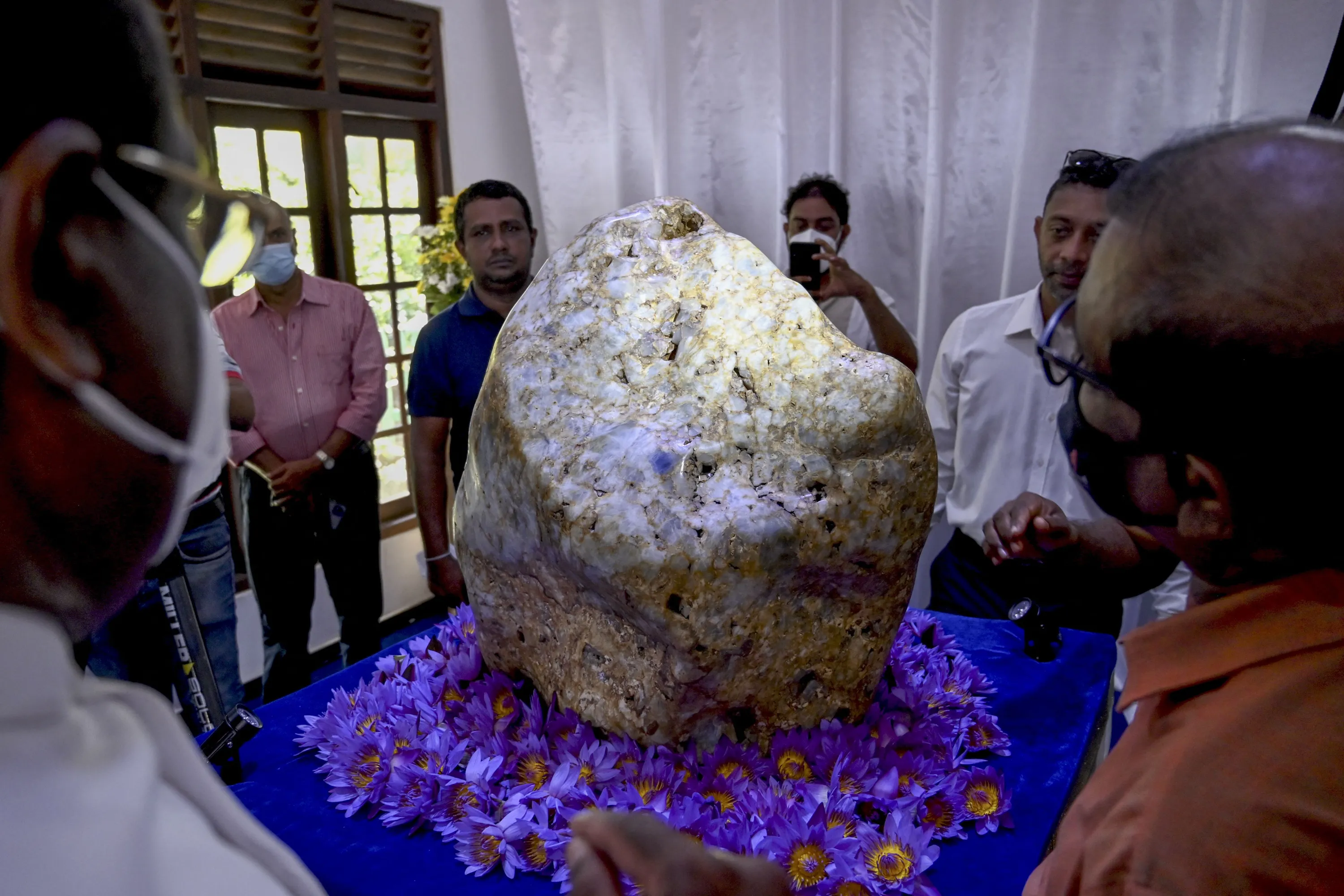 People inspect the single natural corundum (blue sapphire) named “Queen of Asia”, considered the largest found in the world, in Horana, some 45 km from Colombo on December 12, 2021. (Photo by Ishara S. Kodikara/AFP Photo)