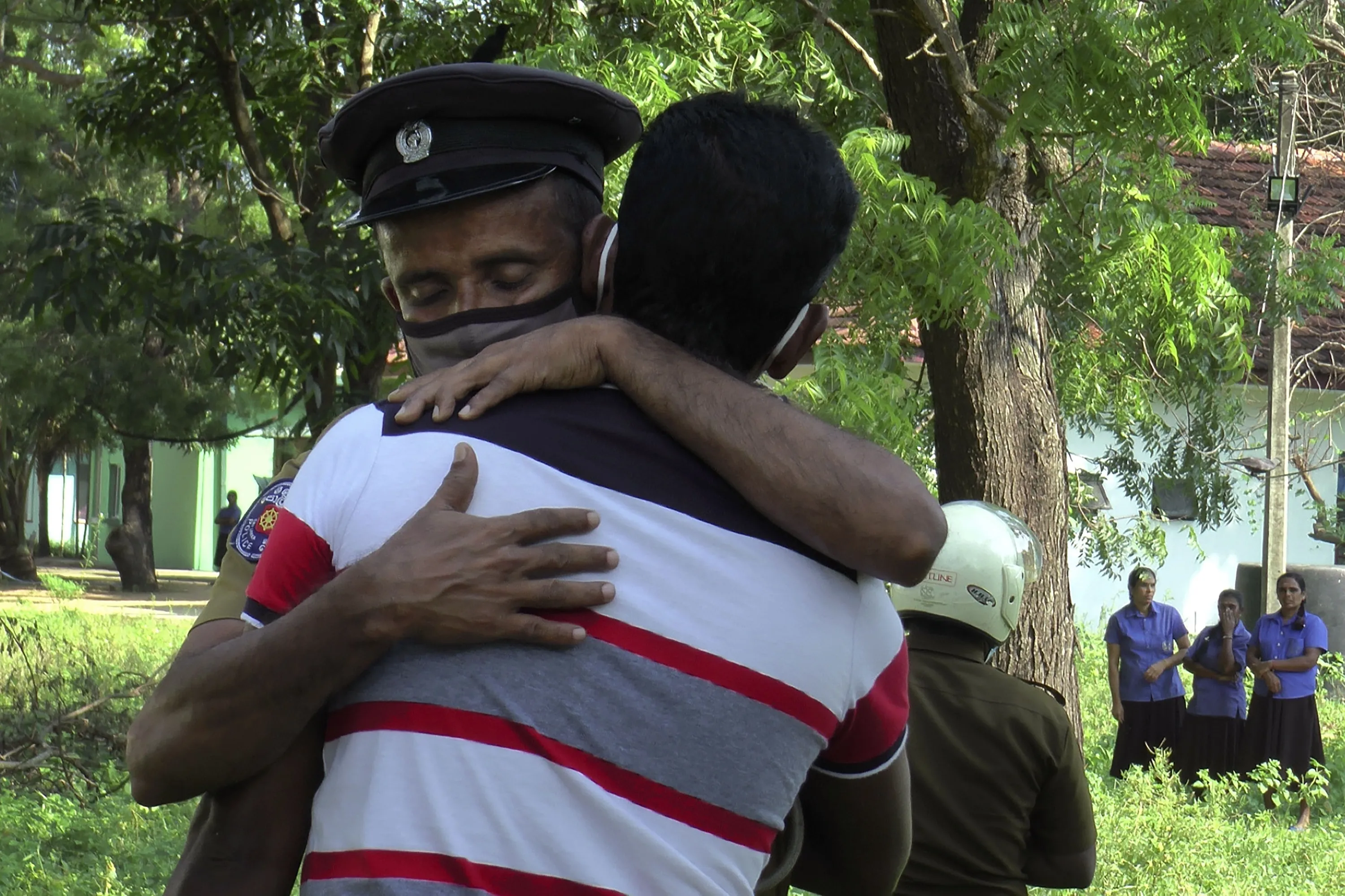 A Sri Lankan police officer, facing camera, hugs to console a relative of a victim at a police station in Thirukkovil, Sri Lanka, Saturday, December 25, 2021. A policeman has opened fire on a group of fellow officers in Sri Lanka, killing four of them and wounding three others. The shooting occurred Friday night inside a police station in the small town of Thirukkovil in eastern Sri Lanka, a police statement said. (Photo by Achala Pussalla/AP Photo)