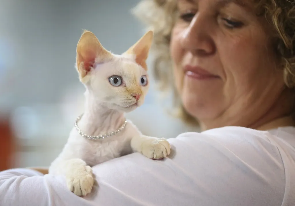 BERLIN, GERMANY - NOVEMBER 02: Petra Rudolph cuddles with her devon rexe cat named Pepita at the pet trade fair (Heimtiermesse) at Velodrom on November 2, 2012 in Berlin, Germany. Exhibitors are showing the latest trends in collars, snacks and other accessories for cats, dogs and other household pets. (Photo by Sean Gallup/Getty Images)