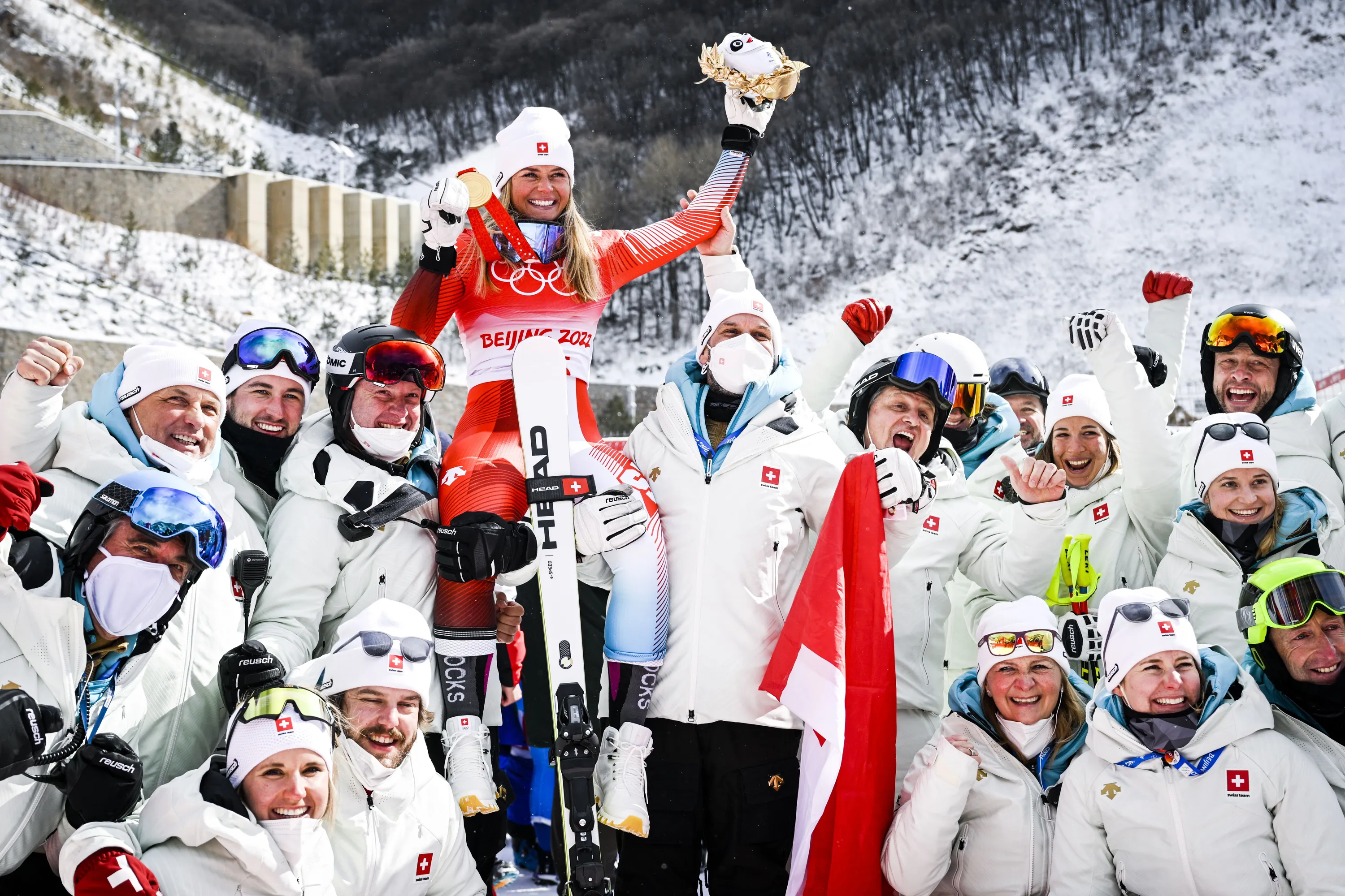 Gold medalist Corinne Suter of Switzerland celebrates with members of the Swiss team after the victory ceremony of the women's downhill race at the Beijing 2022 Olympic Games at the Yanqing National Alpine Ski Centre Skiing, Beijing municipality, China, 15 February 2022. (Photo by Jean-Christophe Bott/EPA/EFE)