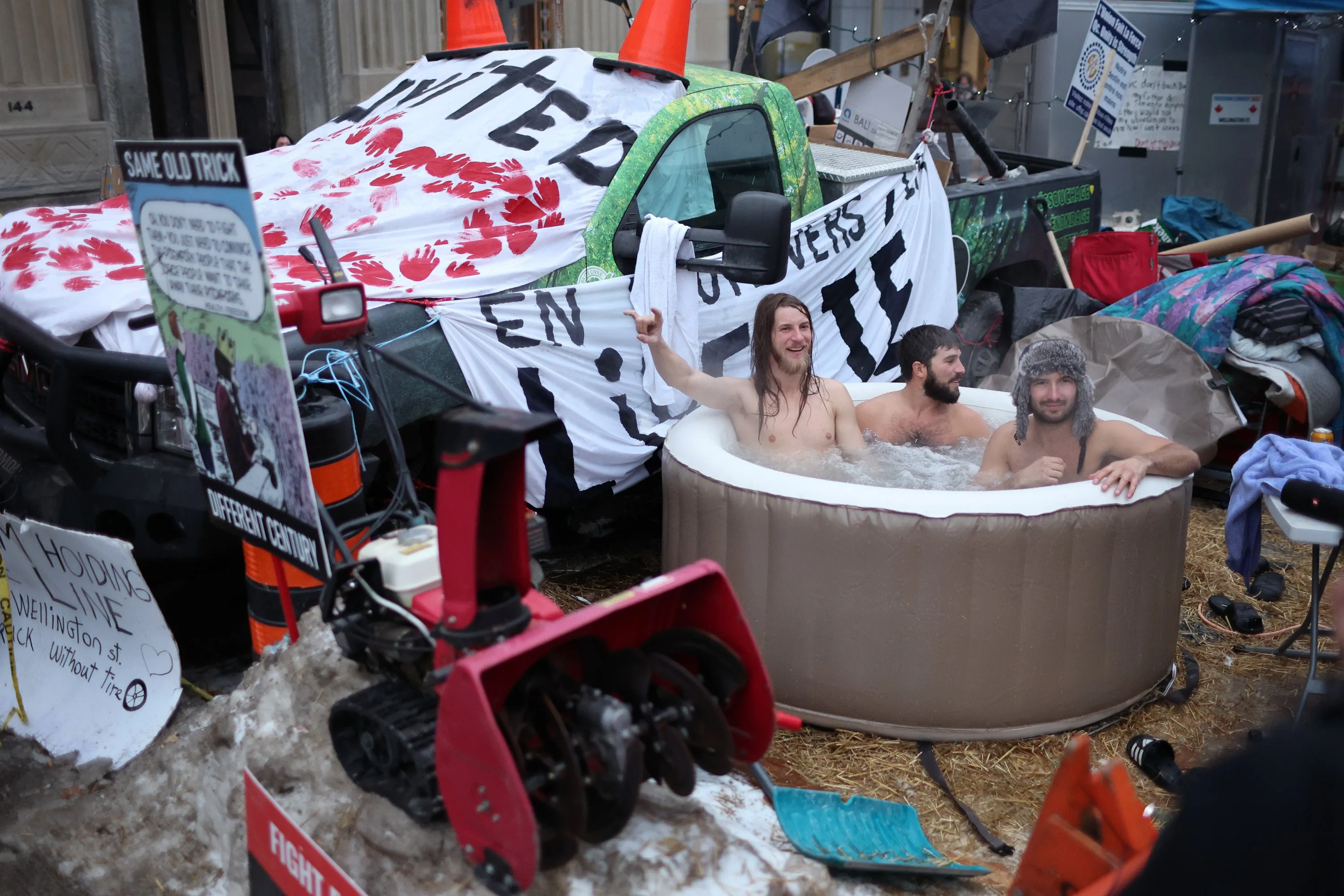 Protestors, participating in a blockade of downtown streets near the parliament building, enjoy a dip in a portable hot tub as a demonstration led by truck drivers opposing vaccine mandates continues on February 16, 2022 in Ottawa, Ontario, Canada Prime Minister Justin Trudeau has invoked the Emergencies Act for the first time in Canada's history to try to put an end to the blockade which is now in it's third week. (Photo by Scott Olson/Getty Images)