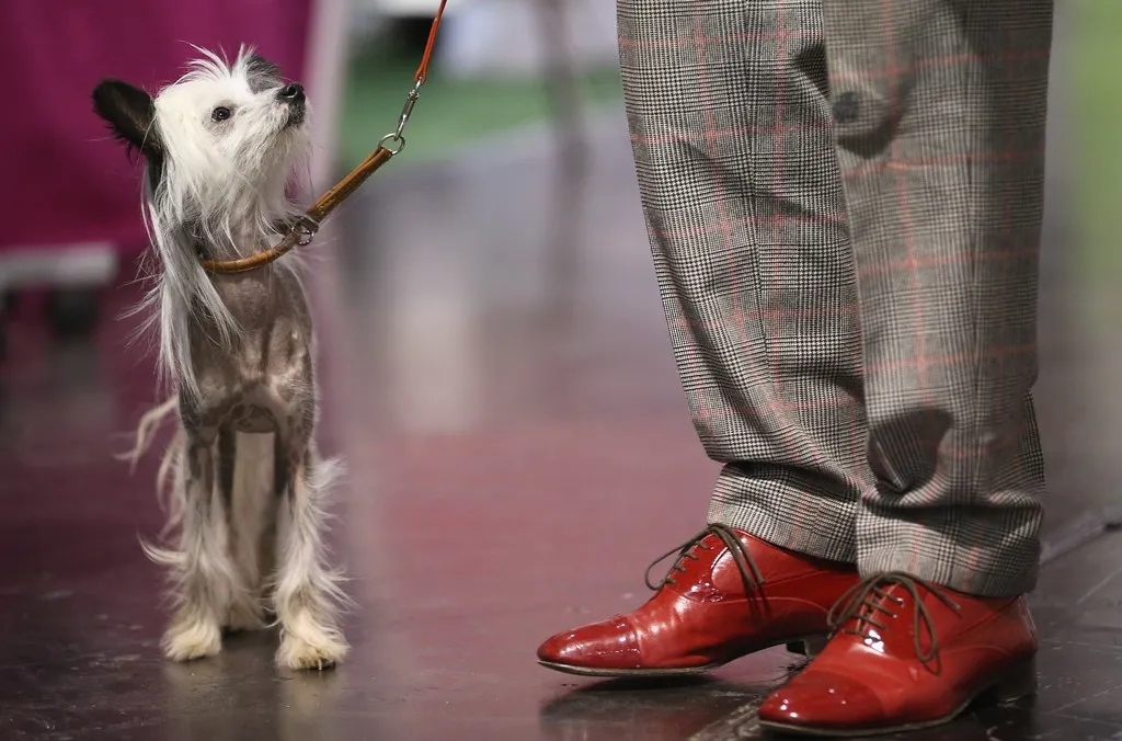 BERLIN, GERMANY - NOVEMBER 02: Hippie, a kind of nearly-hairless dog called a Chinese Crested, stands next to its owner at the pet trade fair (Heimtiermesse) at Velodrom on November 2, 2012 in Berlin, Germany. Exhibitors are showing the latest trends in collars, snacks and other accessories for cats, dogs and other household pets. (Photo by Sean Gallup/Getty Images)