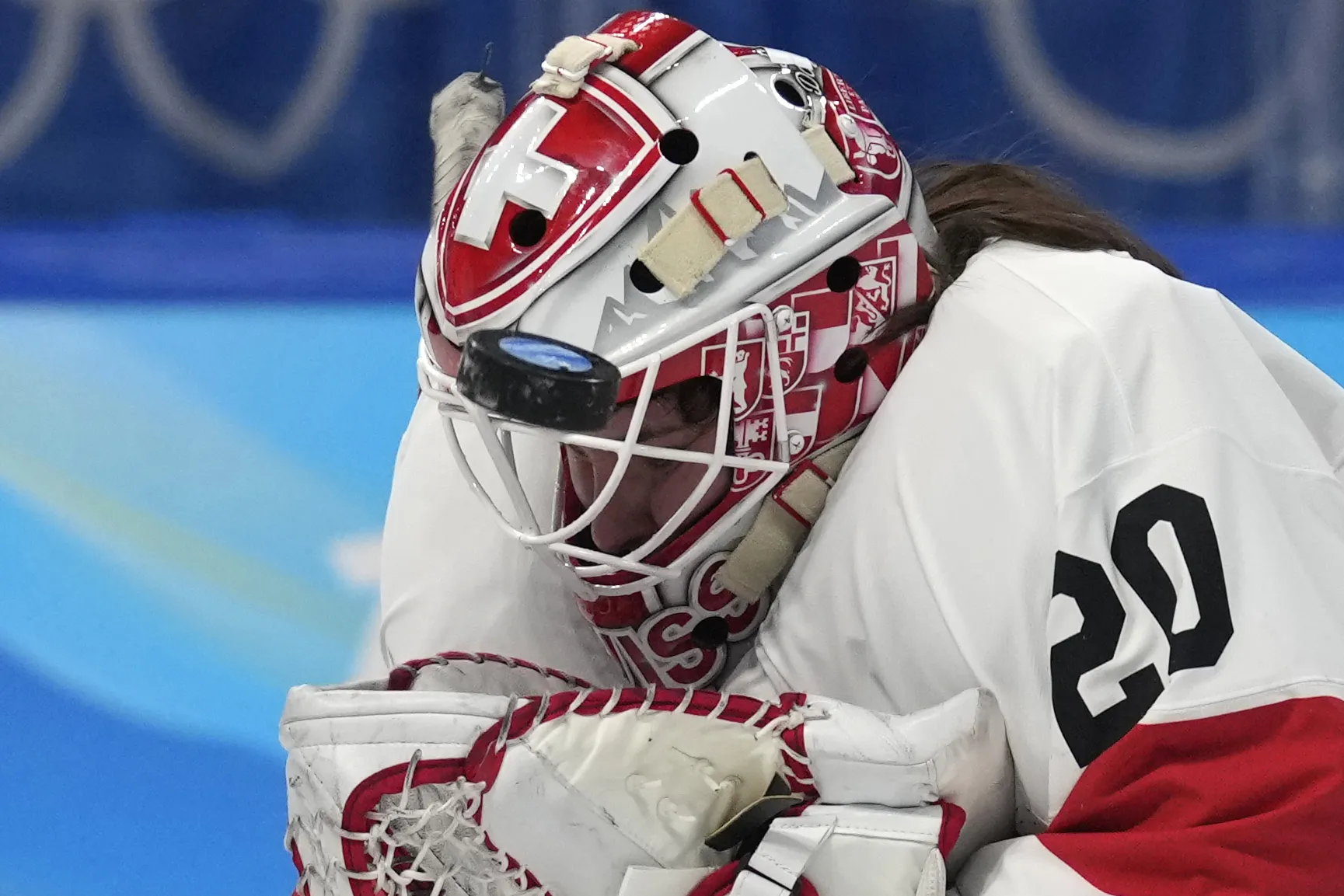 The puck hits the mask of Switzerland goalkeeper Andrea Braendli during the women's bronze medal hockey game against Finland at the 2022 Winter Olympics, Wednesday, February 16, 2022, in Beijing. (Photo by Petr David Josek/AP Photo)