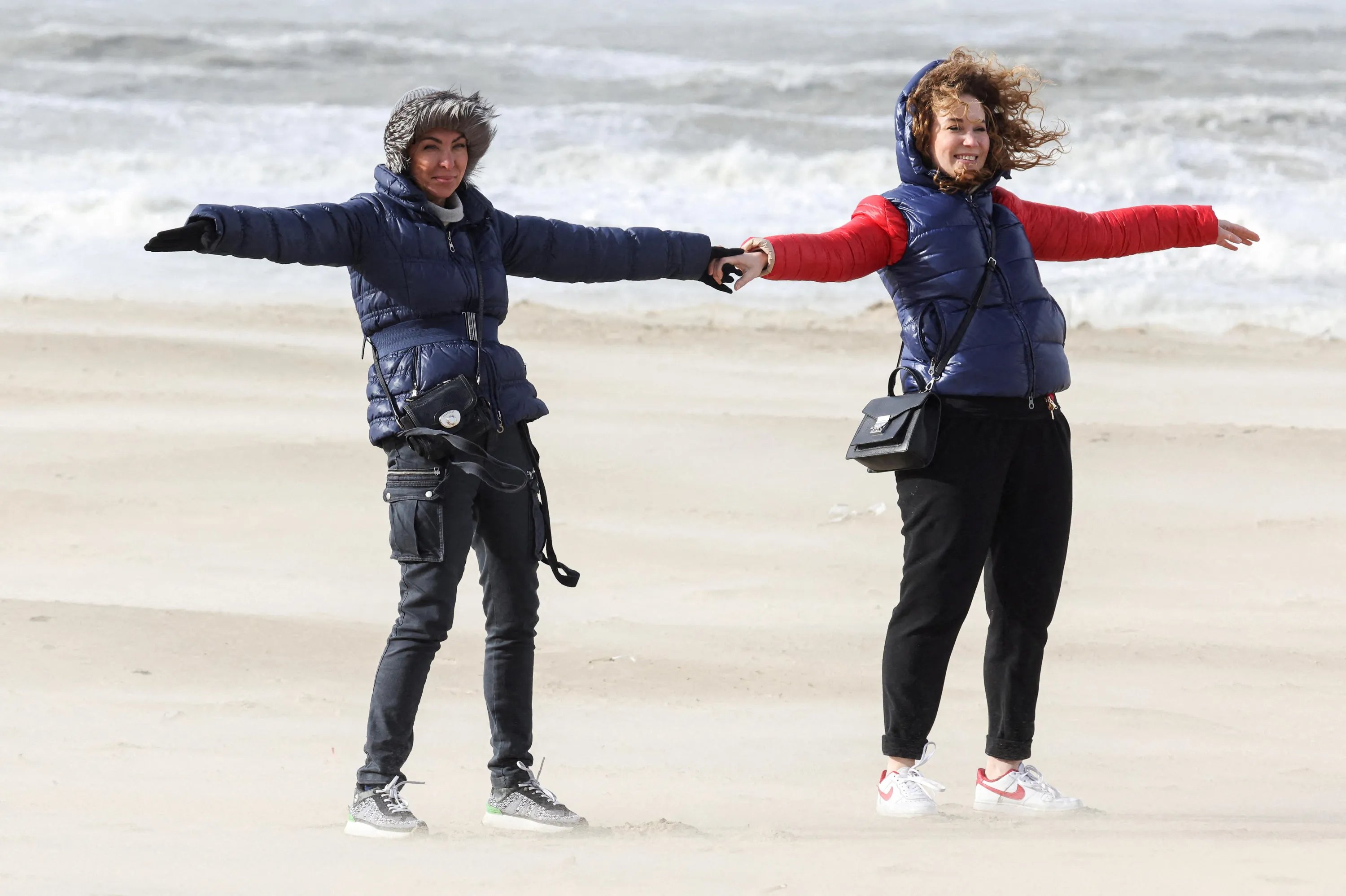 Women spread their arms on the wind as waves break on the beach in the wake of Storm Eunice in Blankenberge, Belgium, February 18, 2022. (Photo by Yves Herman/Reuters)