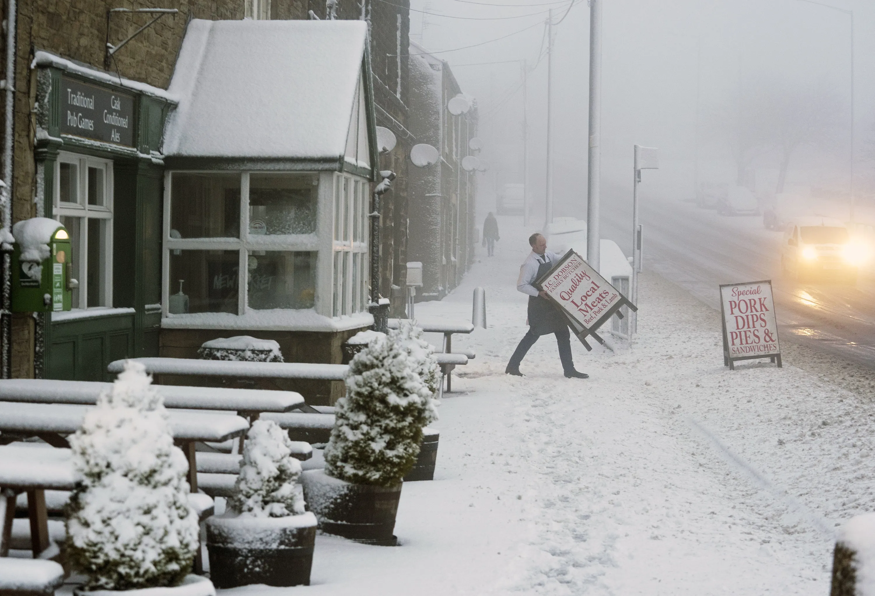 A local butcher carries his shop sign across a snowy pavement in Tow Law, County Durham, Britain, as Storm Eunice makes landfall Friday, February 18, 2022. Millions of Britons are being urged to cancel travel plans and stay indoors Friday amid fears of high winds and flying debris as the second major storm this week prompted a rare “red” weather warning across southern England. (Photo by Owen Humphreys/PA Wire via AP Photo)