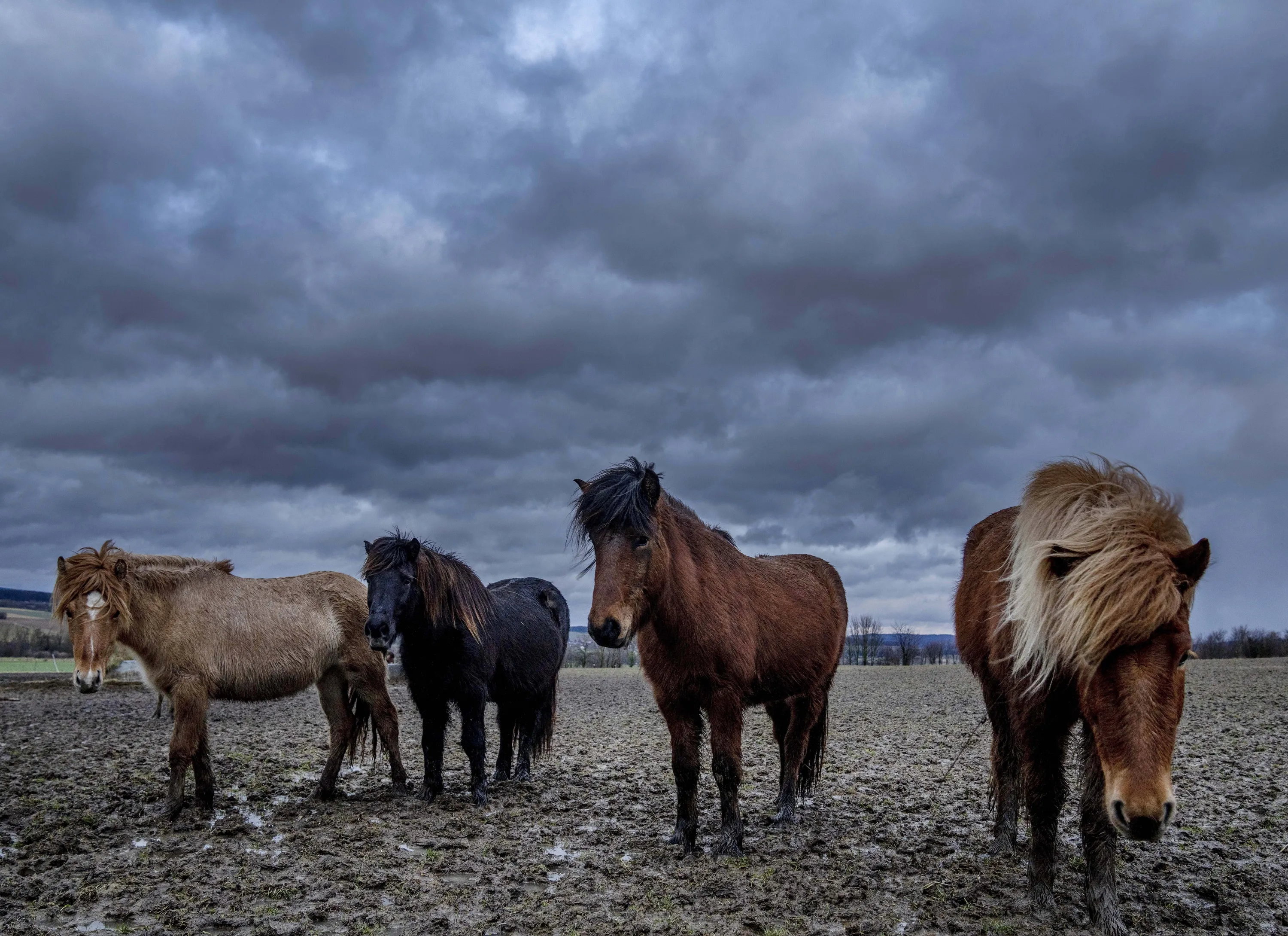 Icelandic horses stand together at a stud farm in Wehrheim near Frankfurt, Germany, Wednesday, February 16, 2022. Parts of Germany expect heavy storms during the next days. (Photo by Michael Probst/AP Photo)