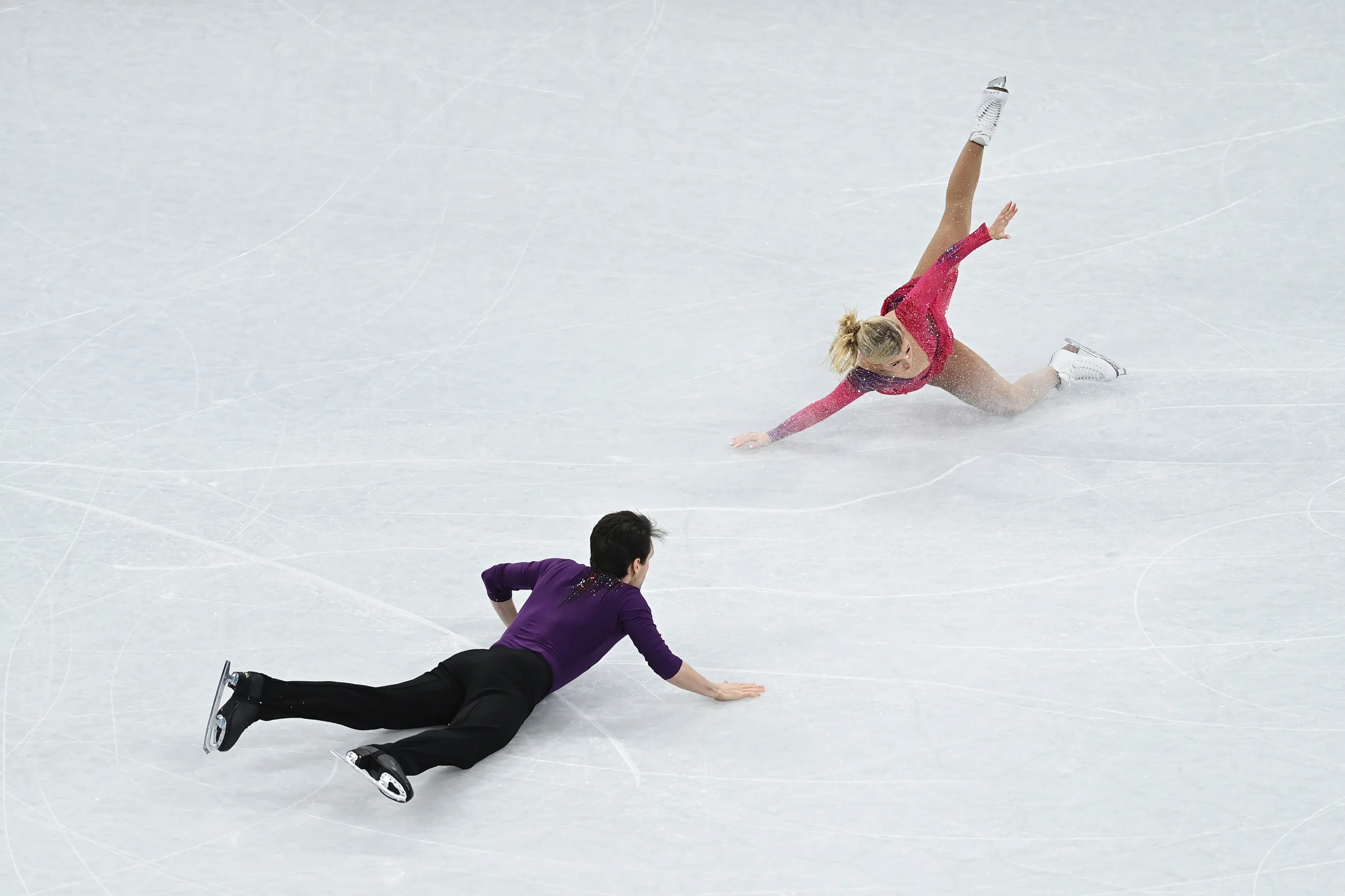 Kirsten Moore-Towers and Michael Marinaro of Team Canada fall during the Pair Skating Short Program on day fourteen of the Beijing 2022 Winter Olympic Games at Capital Indoor Stadium on February 18, 2022 in Beijing, China. (Photo by David Ramos/Getty Images)