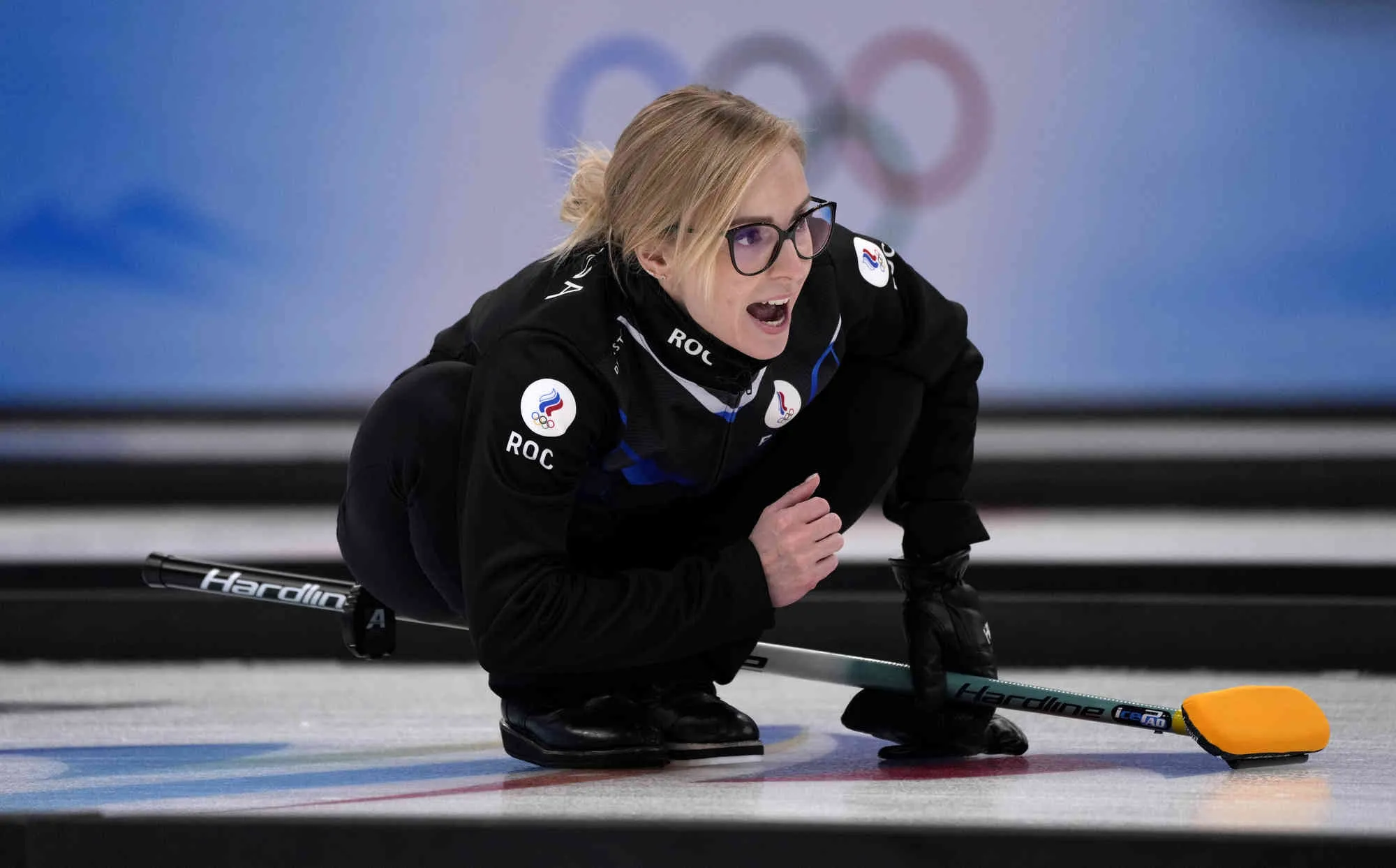 Galina Arsenkina of the Russian Olympic Committee, directs her teammates, during the women's curling match against Britain, at the 2022 Winter Olympics, Thursday, February 17, 2022, in Beijing. (Photo by Nariman El-Mofty/AP Photo)