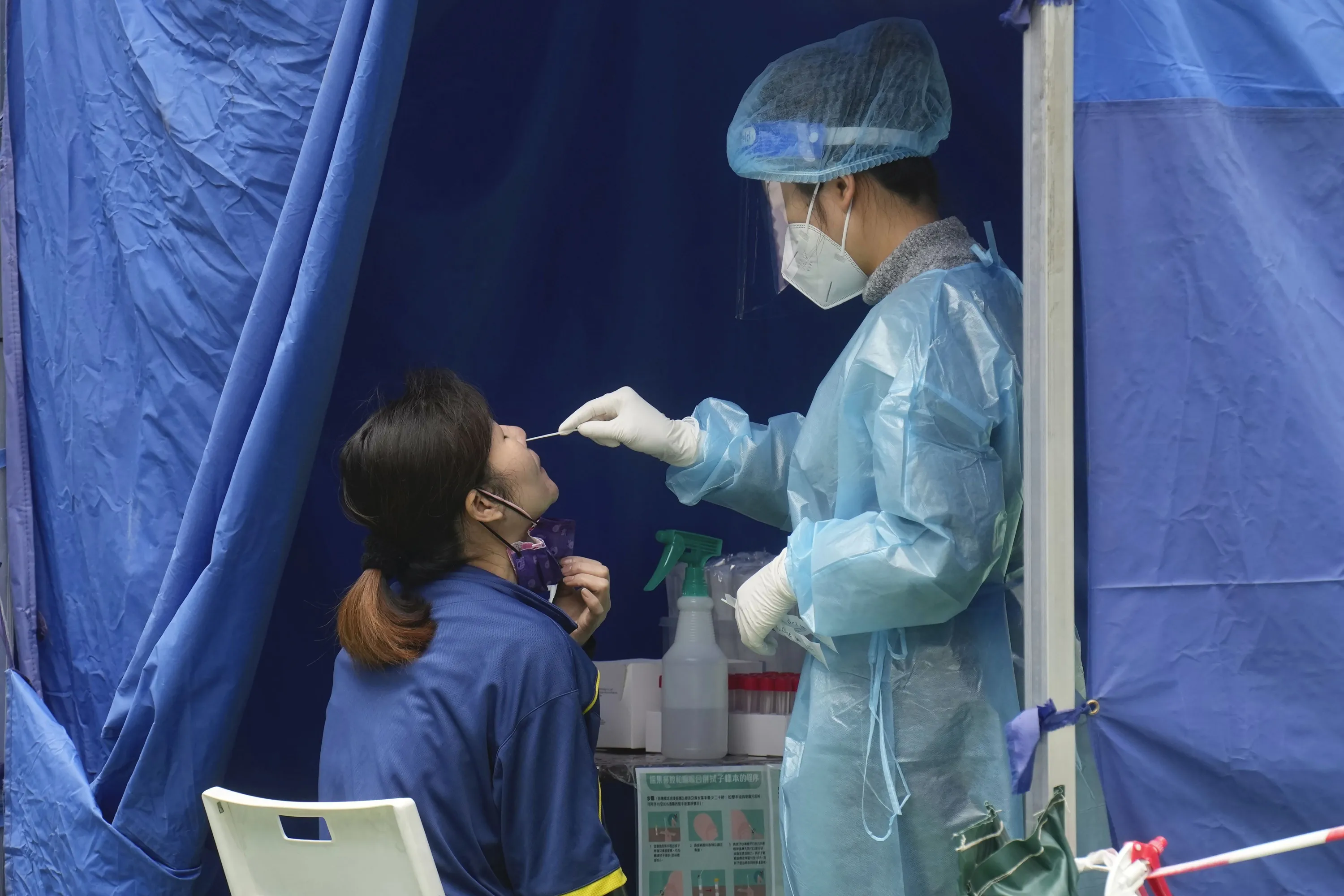 A resident gets tested for the coronavirus at a temporary testing center for the coronavirus in Hong Kong, Thursday, February 10, 2022. (Photo by Vincent Yu/AP Photo)
