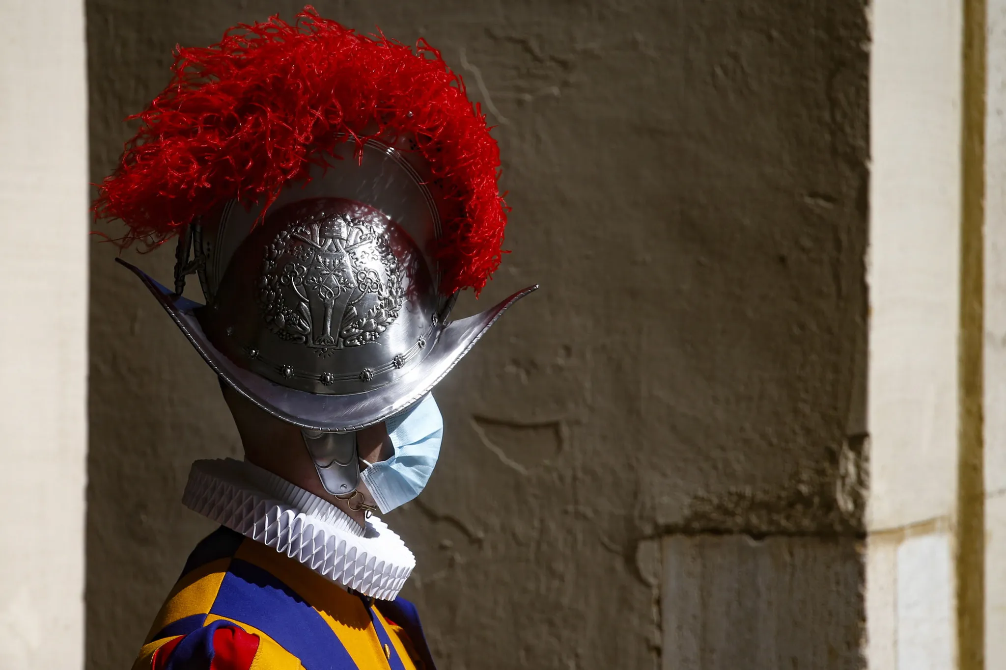 A Swiss Guard wear a face mask during the swearing-in ceremony at the San Damaso Courtyard in Vatican City, 06 May 2021. The swearing-in ceremony for new Swiss Guards usually takes place on and around 06 May. The ceremony commemorates the 147 Swiss Guards who died defending Pope Clement VII in 1527 during the Sack of Rome. (Photo by Fabio Frustaci/EPA/EFE)